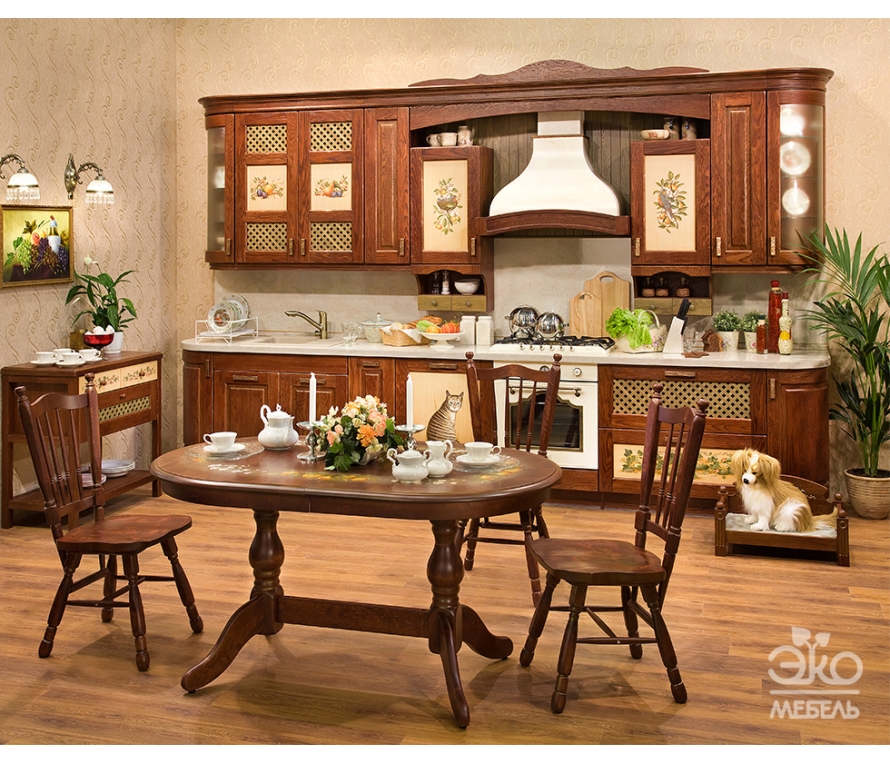 "Альба" - кухня в стиле прованс с широкой рамкой, изготавливается из массива дуба. Рама выполнена с завалами по периметру внешней и внутренней стороны. Филенка может быть выполнена в двух вариантах: из дуба в тон рамы и из МДФ. На филенку из МДФ наносится ручная художественная роспись по вашему желанию.