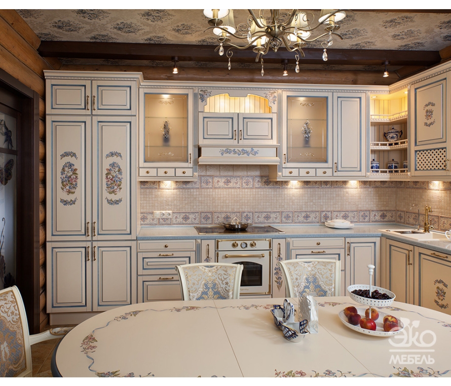 Кухня "Элина" в классическом стиле с нежной цветочной росписью идеально вписалась в интерьер загородного дома. Здесь царит особое весеннее настроение, располагающее к отдыху от городской суеты. Ручная роспись выполнена на заказ и может иметь индивидуальный сюжет. В предметном ряду модели «Элина» представлено более 1000 модулей различной конфигурации. Широкие возможности для хранения кухонной утвари и хозяйственных мелочей создают многофункциональные настольные блоки, пеналы и витрины. Корпус кухни «Элина» может быть изготовлен как из ДСП 18 мм, так и 100% массива березы.