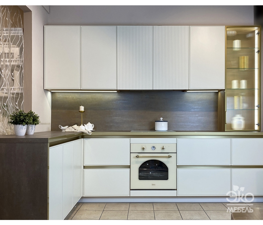 В этом стильном гарнитуре сочетаются 2 вида фрезеровок: рифление и фрезеровка по периметру дверки. Фасады могут быть окрашены в любой тон на ваш выбор. На фото Ral9010. В роли ручек – алюминиевый GOLA профиль в золотой отделке. Стекло Стекло "Флутис" на фасаде настольной витрины сочетается с рифлением фасадов над варочной поверхностью и поддерживает общий ритм всей композиции. Еще один акцент на кухне – ламинированная столешница и стеновая панель. Их выраженная текстура и рельефная поверхность притягивает взгляд.
