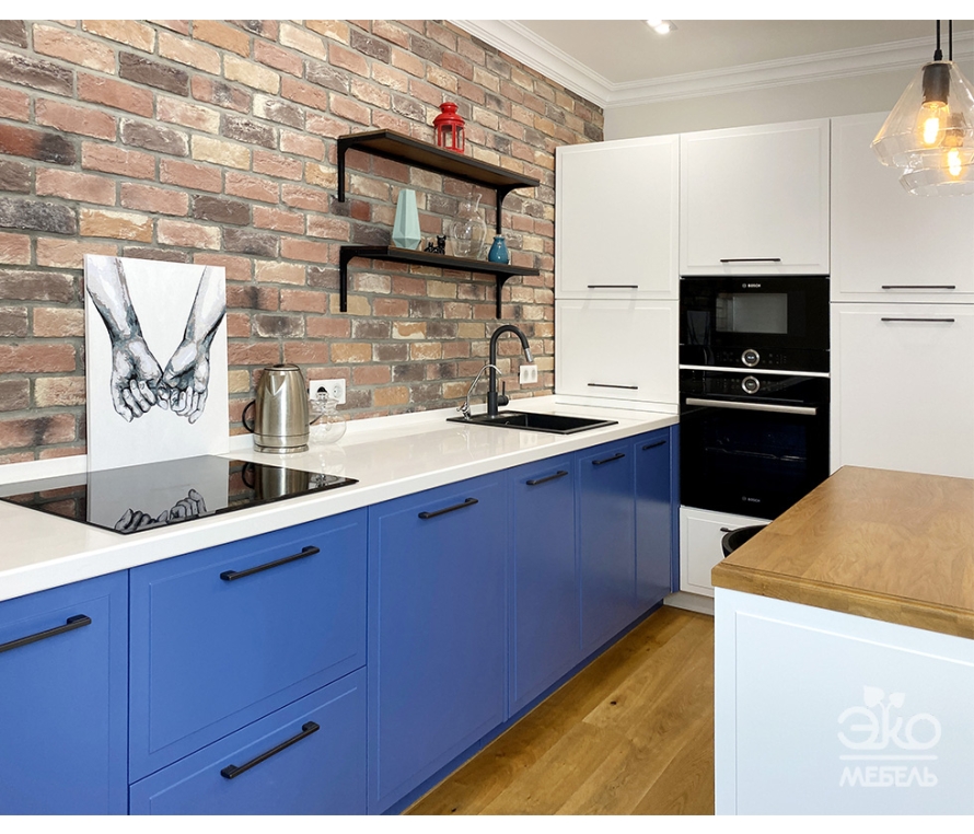 Современная кухня "Эстер" в тонах "лагуна" + "белый". По желанию возможен выкрас в любой цвет из каталога RAL. Фасады МДФ с фрезеровкой, корпус ДСП 18 мм европейского класса Е1, фурнитура BLUM (Австрия), столешница из искусственного камня Stone Twelve от Ligron, мойка из искусственного камня и смеситель Florentina.