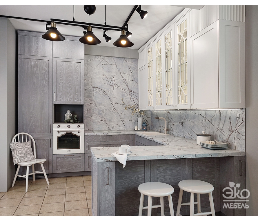 Кухня ИЛОНА + СЕЛЕНА в цвете "Лаванда с белой патиной" – это сдержанная неоклассика с элементами ар-деко. Верхние фасады выполнены из МДФ в элегантном белом цвете с декоративными витражами, которые добавляют кухне лёгкость и делают её визуально просторнее. Нижние шкафы – массив дуба со шпонированными вкладышами в цвете "Лаванда с белой патиной". Это глубокий серый тон с деликатным патинированием, которое почеркивает выразительную текстуру натурального дерева. Обратите внимание на декоративные рифленные фасады кухни – тренд, который с нами уже несколько сезонов и продолжает оставаться актуальным. Фартук и столешница под мрамор завершают образ, придавая интерьеру нотку премиальности и современности! Кухня оснащена дополнительной подсветкой рабочего места, а также продуманной системой хранения: это выдвижные ящики, выкатные корзины и вместительные шкафы, что позволяет рационально использовать каждый сантиметр пространства. Главной изюминкой кухни является уютный уголок-полуостров, который служит дополнительной рабочей зоной для готовки, а также местом для быстрых завтраков или перекусов.