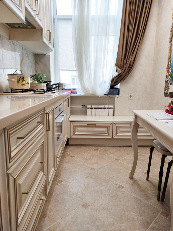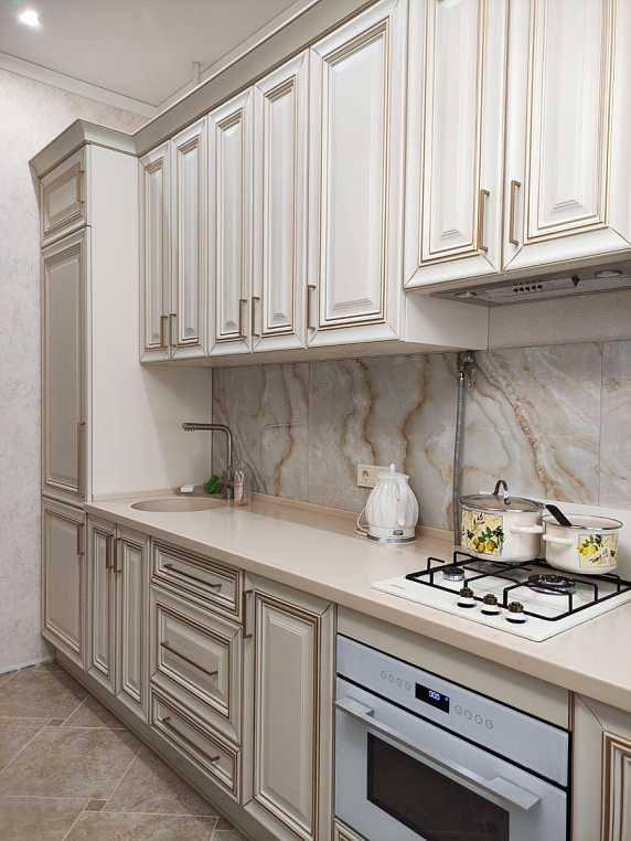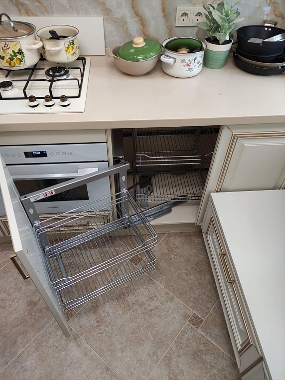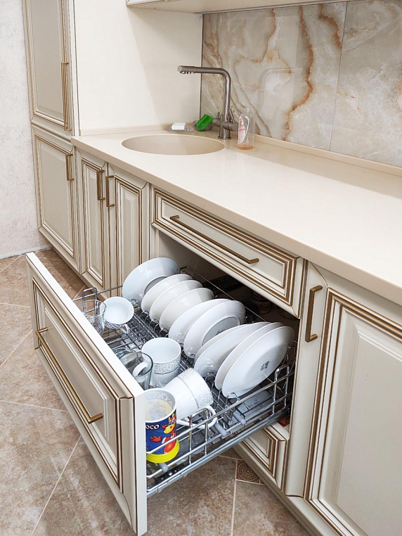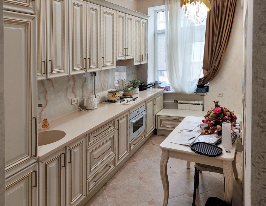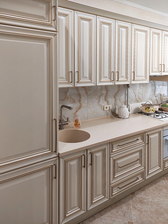 Классическая кухня с МДФ фасадами, изысканность которым придает патина в цвете Золото. Завершенным проект делают декоративные пилястры и ручки в цвет патины.