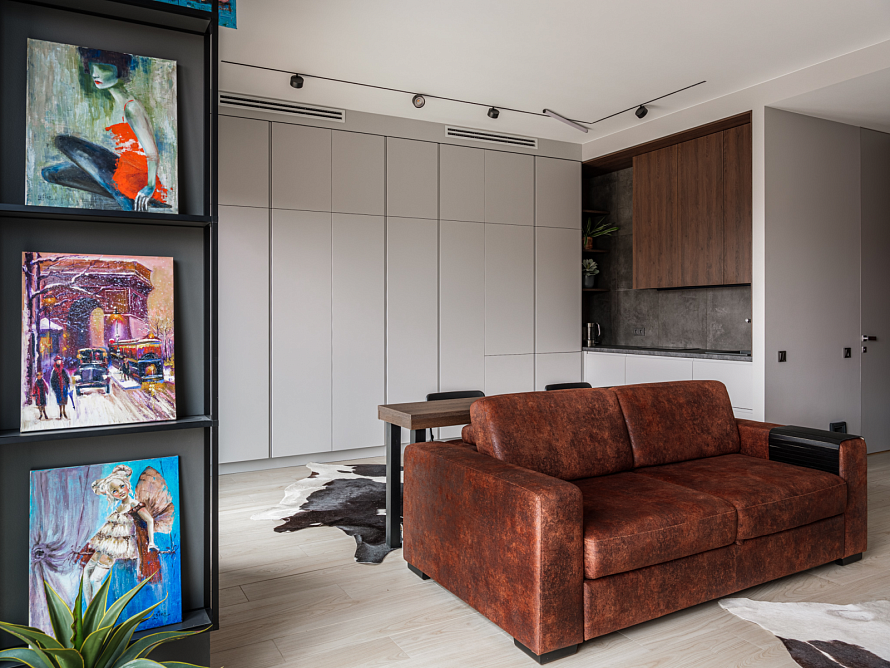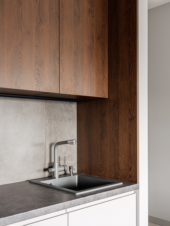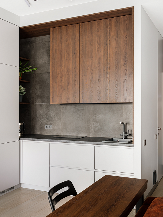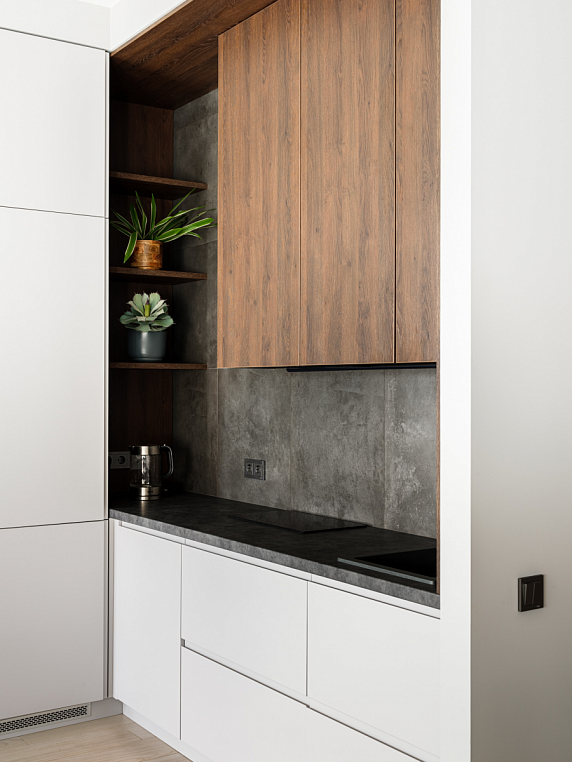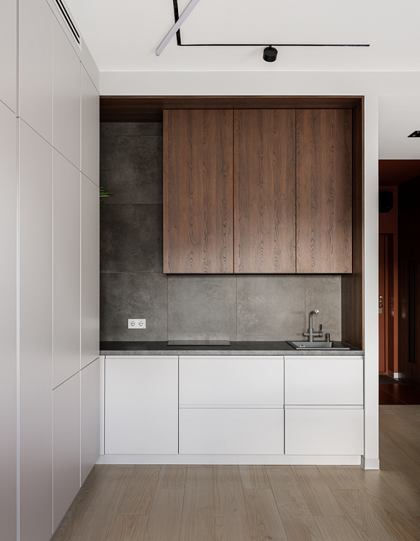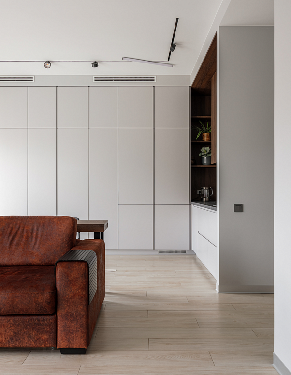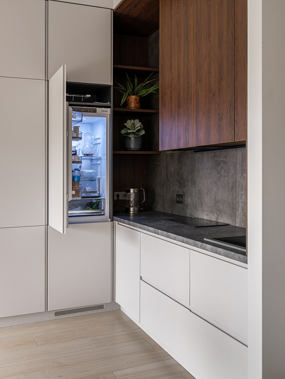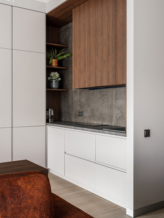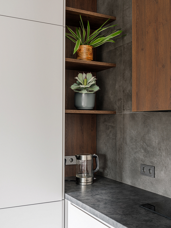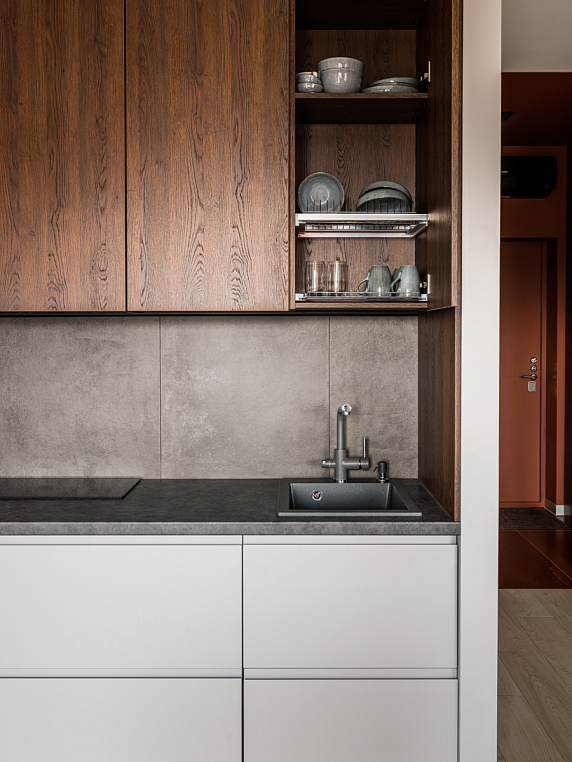 *Указана стоимость изделия в минимальной комплектации Угловая кухня плавно переходит в зону гостиной, а кухонный шкаф является продолжением встроенного шкафа. Посмотреть реализованный проект можно по ссылке