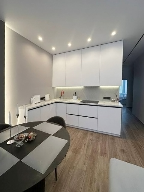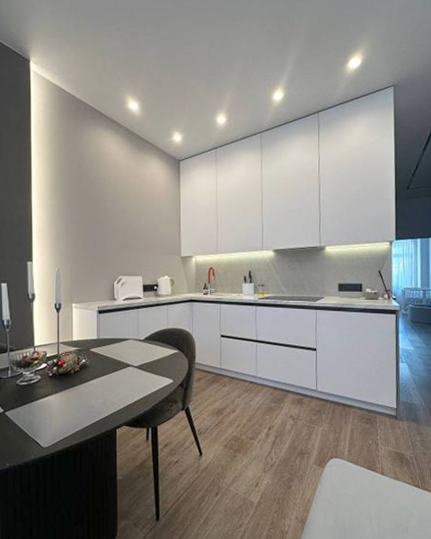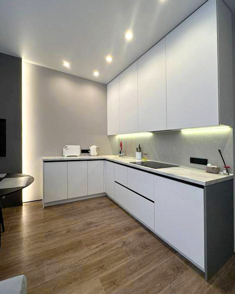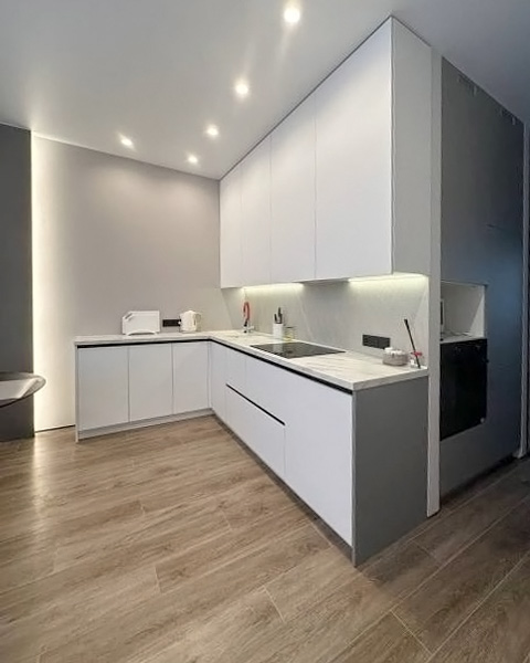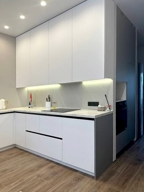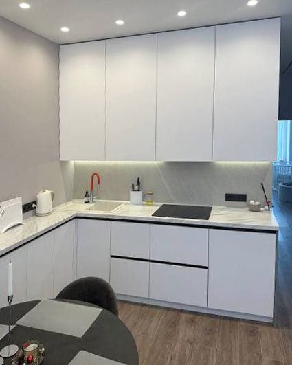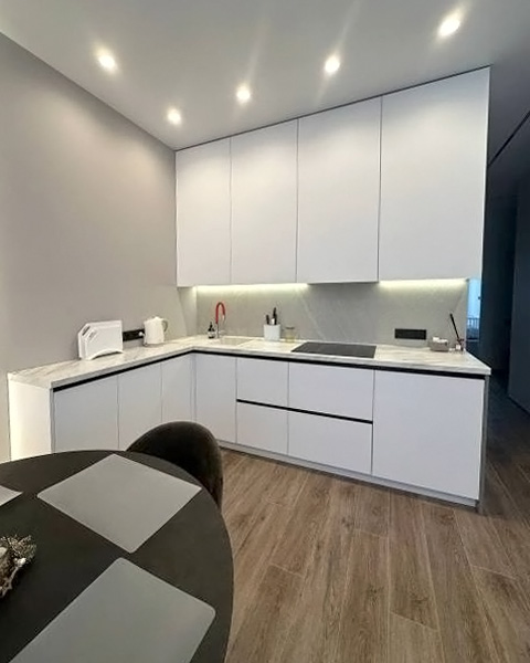 Угловая кухня: стиль, функциональность и удобство Ищете идеальное решение для вашей кухни? Угловая кухня с внутренним и внешним углом — это то, что вам нужно! Почему стоит выбрать угловую кухню? Стильный дизайн. Угловая кухня станет настоящим украшением вашего дома. Функциональность. Встроенная техника обеспечит удобство и комфорт в использовании. Современный интерьер. Фасады из МДФ Suprat создадут стильный и элегантный интерьер. Изысканность и удобство. Врезная ручка Gola добавит кухне изысканности и сделает её удобной в эксплуатации. Подсветка. Подсветка станет функциональным и интерьерным дополнением изделия. Не упустите возможность приобрести угловую кухню, которая станет идеальным решением для вашей кухни! *Указана минимальная стоимость изделия без учета стоимости услуг.