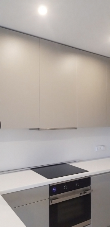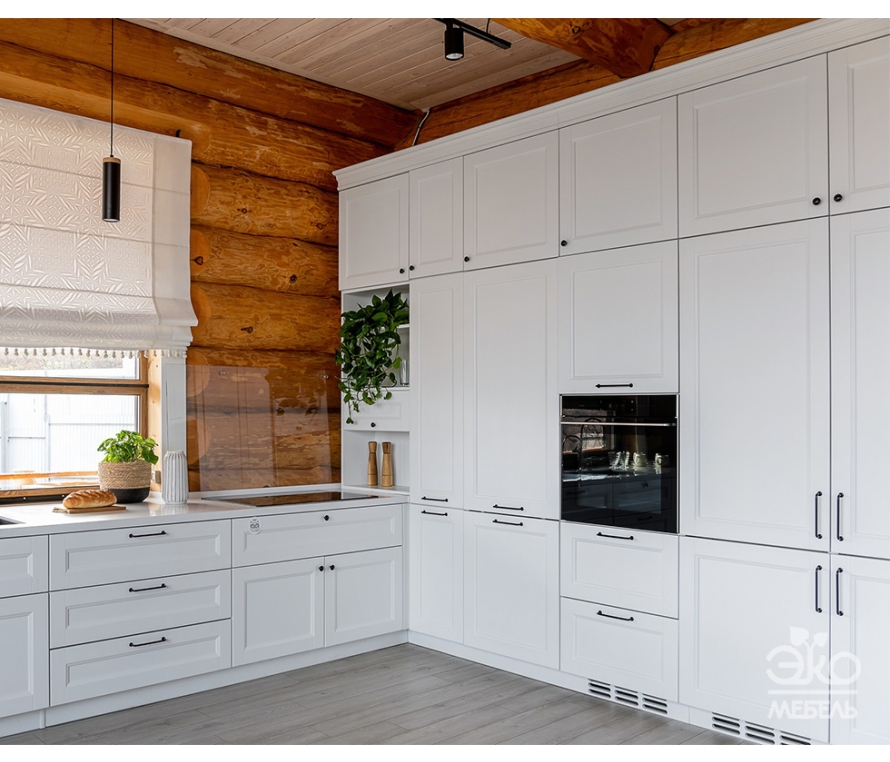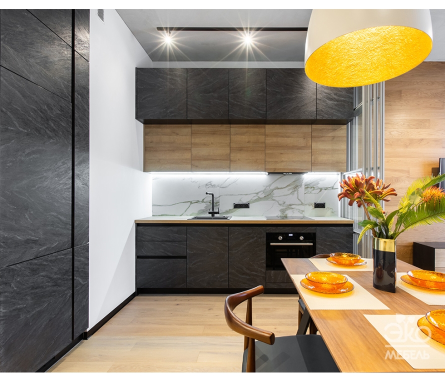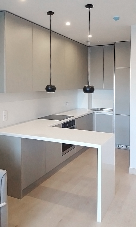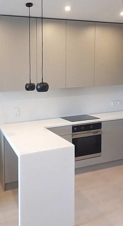 Угловая кухня из ЛДСП Egger. Для реализации кухни выбран современный оттенок Серая галька, который, в отличие от холодных серых тонов, смотрится более теплым. Дополняет дизайн кухни столешница из искусственного камня. Ящики кухни оборудованы фурнитурой Blum (Tandem Blumotion).