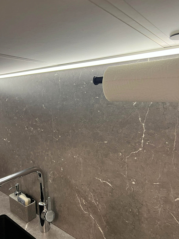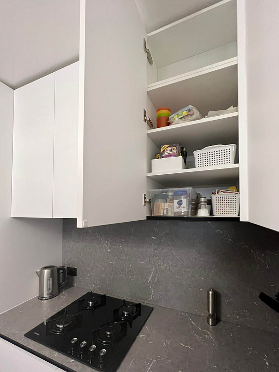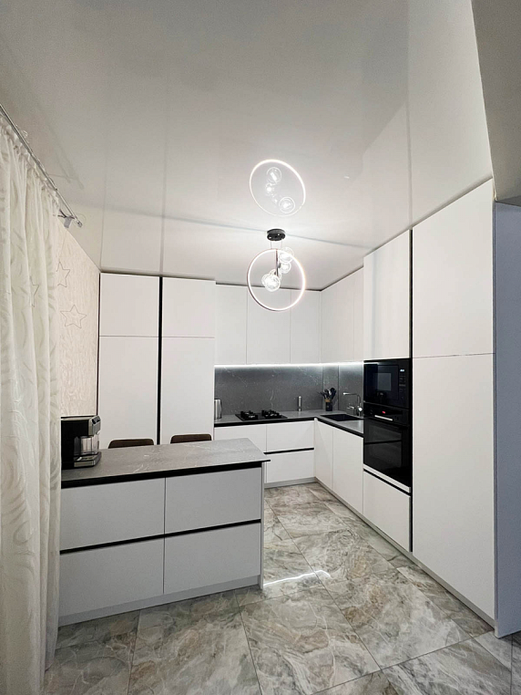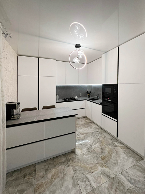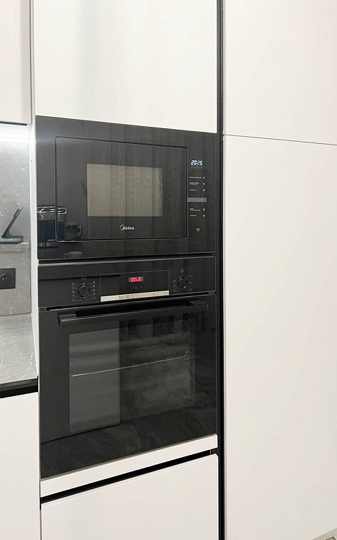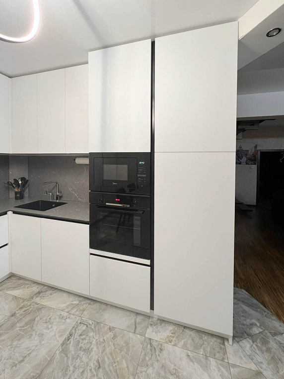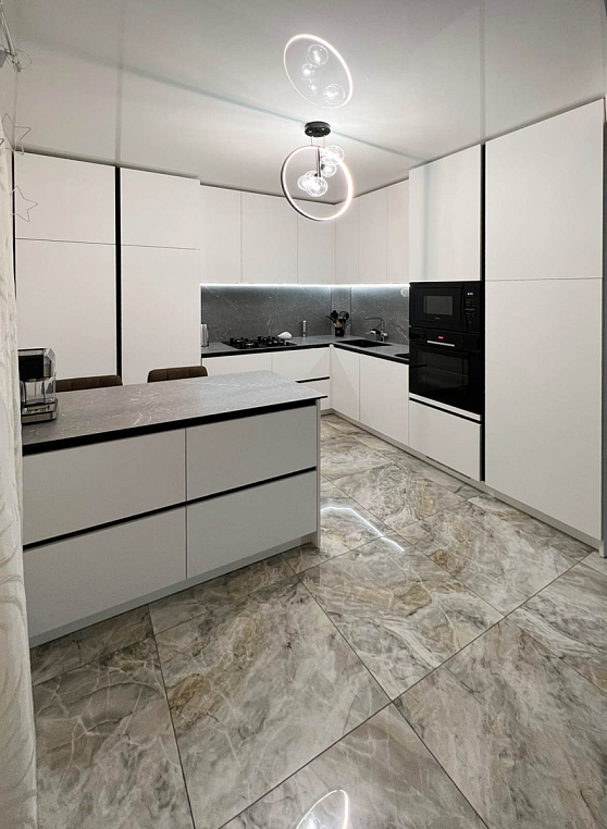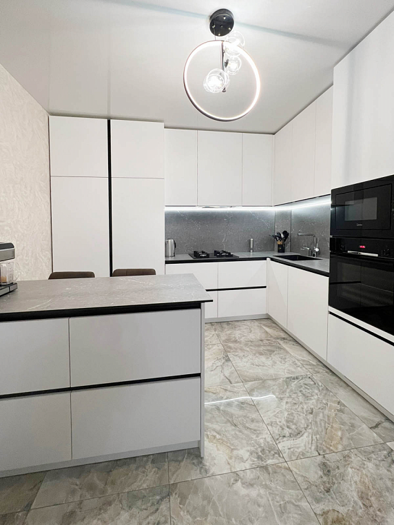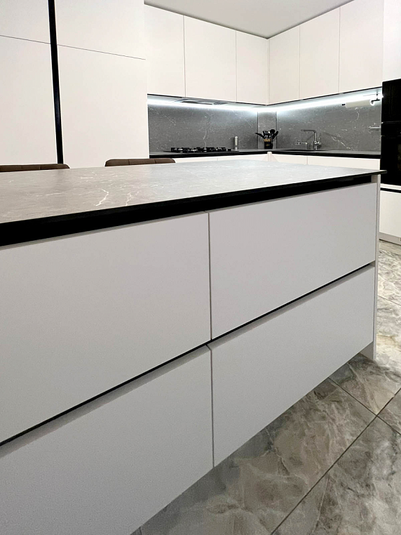 Угловая кухня выполнена из ЛДСП Egger с МДФ фасадами коллекции Supramat. Столешница автрийского производства 12мм из HPL материала, в котороую интегрирована мойка. Гарабритные размеры кухни: 2600*3168/2911*600/400, остров корпус: 1300*872*500, столешница: 1400/800 *Указана стоимость выставочного образца в минимальной комплектации без учета стоимости услуг.