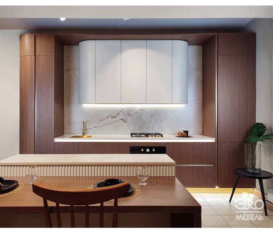 Кухня из натурального дерева в эко-исполнении – настоящая "изюминка" интерьера. Нижние шкафы – фасады "Мари" из массива дуба, верх из массива березы в нестандартном тоне на заказ. Строгие прямые линии и гармоничное сочетание цветов придают этой кухне особый шарм. Просторные ящики и шкафы обеспечивают удобное хранение посуды и кухонных принадлежностей. Фасады "Мари" изготавливаются из массива дуба и доступны в большом количестве оттенков. Корпус гарнитура может быть комбинированным или выполненным в эко-варианте. В первом случае используется ДСП толщиной 18 мм, во втором – 100%-й массив дуба.