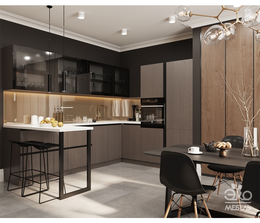 Фасады этой стильной кухни выполнены из шпона дуба. Этот теплый и благородный материал создает приятную атмосферу и придает особый шарм всему интерьеру. Кухонное пространство оформлено с учетом современных тенденций в дизайне. Здесь присутствуют строгие линии, геометричные формы и функциональность. Современная бытовая техника идеально дополняет образ кухни.