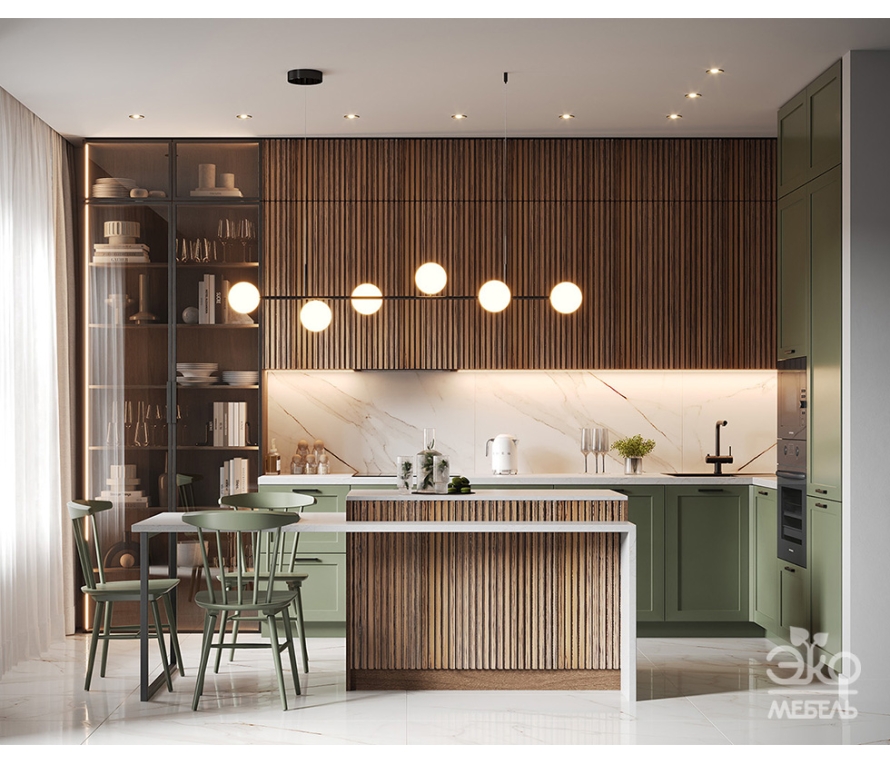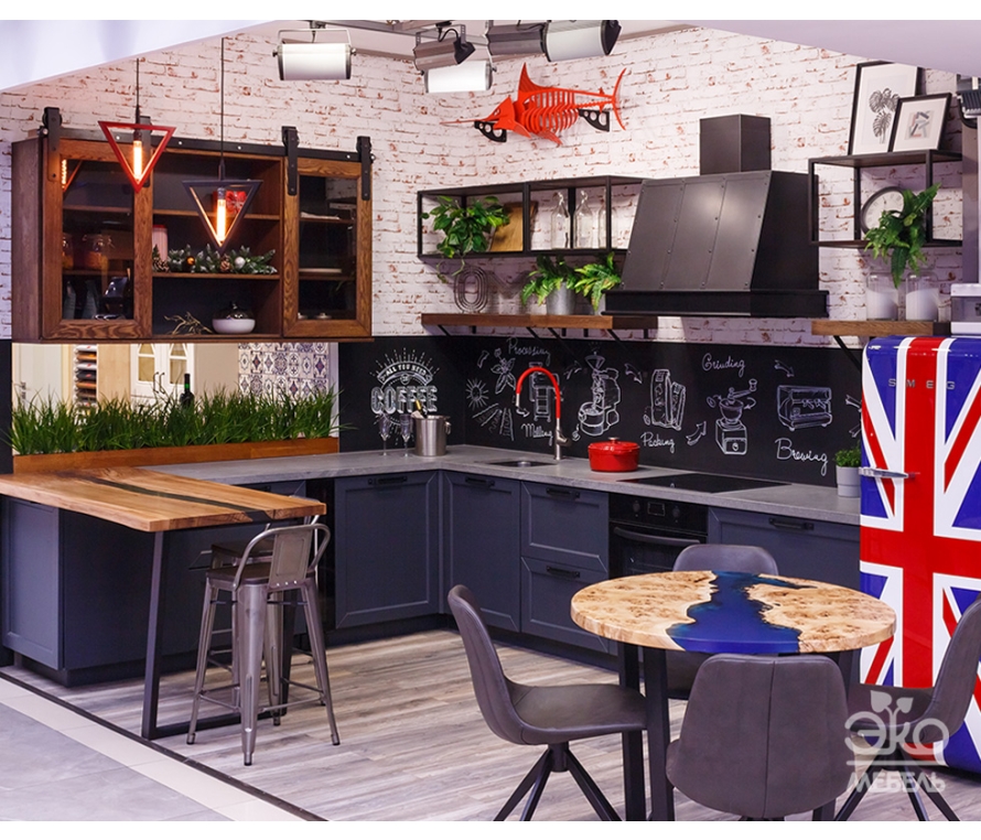 Яркий и креативный интерьер в стиле лофт, где каждая деталь на своем месте. Фасады – натуральное дерево. Вытяжка и элементы из черного металла подчеркивают общую концепцию интерьера.