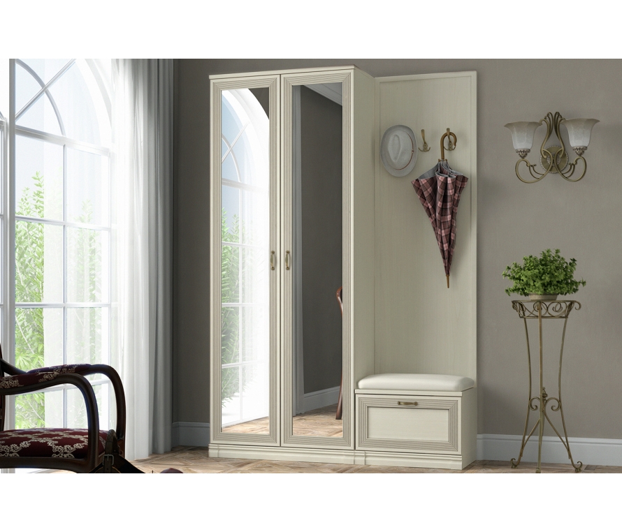 Характеристики:Двустворчатый шкаф с зеркальными фасадами;В комплект входит евровешалка, в узком отделении — 5 полок ЛДСП;Цвет: валенсия;Цвет внешней фурнитуры: старинная латунь;Отделения шкафа при сборке можно менять местами;Можно комплектовать широкое отделение 1 сетчатой полкой АГ-006.08;Если шкаф является завершающим или будет стоять отдельно, необходимо дополнительно комплектовать боковым цоколем АГ-012.01.Материалы:Корпус: ЛДСП 16 и 22 мм;Фасады: ЛДСП 16 мм, зеркало в рамке из профиля МДФ;Профиль покрыт лаком и патиной;Опоры скрыты декоративным цоколем из профиля МДФ;Петли Titus с доводчиком.