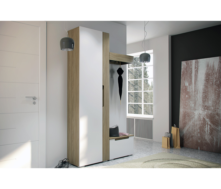 Прямой напольный шкаф-пенал благодаря компактным размерам подойдет для обустройства прихожей, малогабаритной гостиной и небольшой спальни. Сдержанный лаконичный дизайн, отсутствие лишних деталей, строгое цветовое решение делают изделие идеальным для интерьера в стиле сканди, эко, облегченный лофт. Профильная ручка отлично вписывается в общую композицию, подчеркивая минималистичность мебели.Прочные фасады из МДФ в ПВХ-пленке текстурированы под дерево «швейцарский вяз» и украшены вставкой базового белого цвета. Такое оформление зрительно вытягивает помещение в вертикальном направлении. Все детали облицованы кромочным материалом высокого качества, защищающим древесную плиту от порчи и расслоения. Внутри одностворчатый шкаф укомплектован евроштангой и двумя полками, по запросу покупателя могут быть установлены 4 полочки из ламинированной ДСП. В комплектацию входят крепеж и фурнитура.Характеристики:Одностворчатый шкаф укомплектован двумя полками и выдвижной штангой для одежды;Цвет: швейцарский вяз, белый;Отдельно стоящий шкаф необходимо крепить к стене во избежание опрокидывания;Фасад может навешиваться на правую или на левую сторону;Можно установить дополнительно 4 полки ЛДСП (АН-002.00 — 2 шт).Материалы:Корпус: ЛДСП 1,6 см класса эмиссии Е1;Фасад: МДФ 1,9 см в пленке ПВХ;Задняя стенка: ДВП;Для облицовывания кромок деталей используется высококачественный материал от ключевых производителей;Крепежная фурнитура и механизмы ведущих производителей.