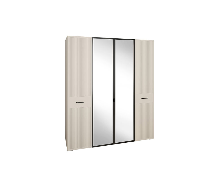 Характеристики:Цвет: кашемир серый;Цвет ручек: чёрный матовый;Шкаф необходимо крепить к стене во избежание опрокидывания;Шкаф укомплектован полками и штангой для белья;Шкаф можно заказать в цвете белый премиум.Материалы:Каркас: ЛДСП 16 мм;Два центральных фасада: профиль МДФ, окутанный серой бумагой «графит», вставка — зеркало пепельного оттенка «графит»;Два боковых фасада: МДФ с декоративной фрезеровкой в виде вертикальных полос и окутаны плёнкой ПВХ;Фасады укомплектованы петлями МакМарт с доводчиками;Ручки: металл;Шкаф установлен на пластиковых опорах высотой 2 см, регулируемых по высоте.