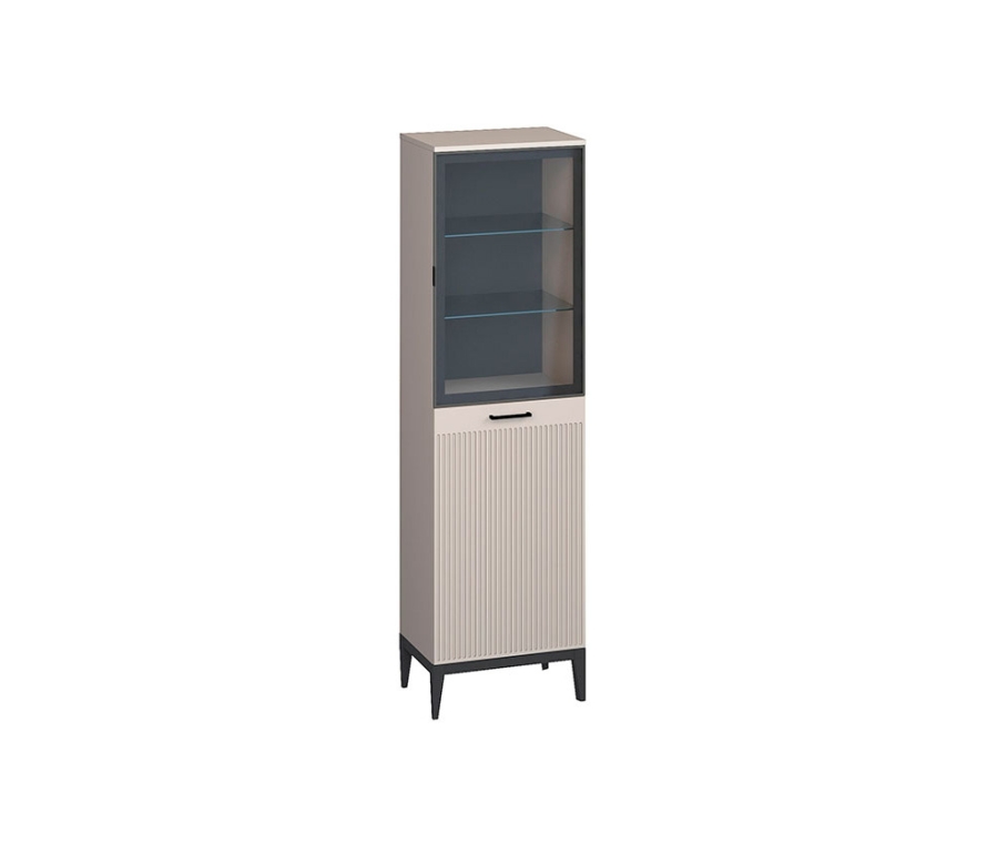 Характеристики:Цвет: кашемир серый;Цвет ручек: чёрный матовый;Цвет задней стенки за стеклянным фасадом: графит;Наполнение шкафа: верхний отдел с двумя стеклянными полками, нижний отдел с двумя полками из ЛДСП.Материалы:Каркас: ЛДСП 1,6 см;Нижний фасад: МДФ с фрезеровкой, окутан плёнкой ПВХ;Верхний фасад: рамочной конструкции из профиля МДФ, окутанного бумагой серого цвета, вставка из стекла;Ручки: металл;Опоры: деревянные с эмалевой отделкой серого цвета;Фасады укомплектованы петлями МакМарт с доводчиками.