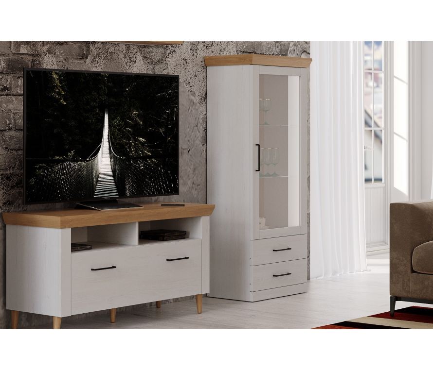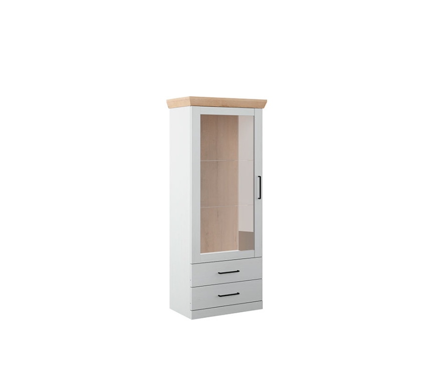Характеристики:Вверху отделение с двумя стеклополками, с распашной рамочной дверью (вставка двери — стекло прозрачное 4 мм), внизу — два выдвижных ящика на направляющих скрытого монтажа со встроенным доводчиком;Фасады ящиков — ЛДСП 22 мм;Модуль можно собрать левосторонним или правосторонним;Цвет: блан-шене, дуб бунратти;Максимальная нагрузка в ящик — не более 6 кг;За стеклополками можно дополнительно установить подсветку ПС-600мм;Отдельно стоящий шкаф необходимо крепить к стене во избежание опрокидывания.