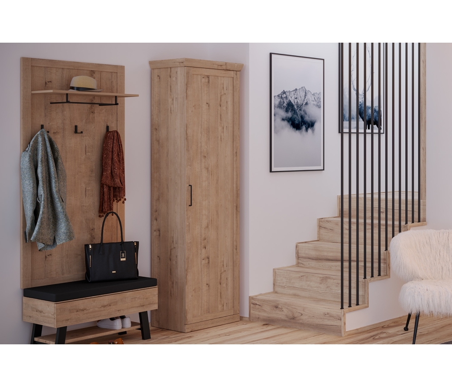 Характеристики:Шкаф с глухим фасадом, с внутренним наполнением;Укомплектован выдвижной штангой для одежды;Дверь можно перевесить на правую сторону;Дополнительно можно приобрести комплект полок МГ-006.00;Отдельно стоящий шкаф необходимо крепить к стене во избежание опрокидывания.