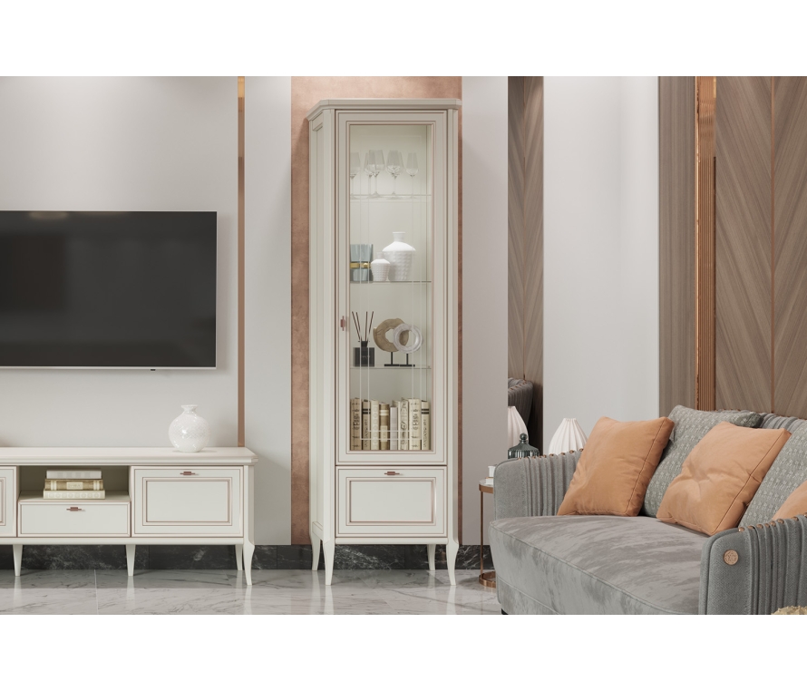 Характеристики:Шкаф с рамочным фасадом и одним выдвижным ящиком;За дверью 3 стеклополки;В выдвижной ящик можно класть не более 5-7 кг, при этом нагрузка должна быть распределена по всему дну (не класть тяжелые предметы, которые могут повредить и выдавить дно);Толщина крышки 41 см.Материалы:Корпус: ЛДСП;Фасады рамочные, вставка — стекло;Опоры изготовлены из массива бука (крашеные с эффектом протирания);Для облицовывания кромок деталей используется высококачественный материал производства Германии, Австрии;Для выдвижного ящика используется система скрытых направляющих Quadro со встроенным доводчиком (Германия, Hettich);Крепежная фурнитура и механизмы ведущих производителей (Titus, Hettiсh).