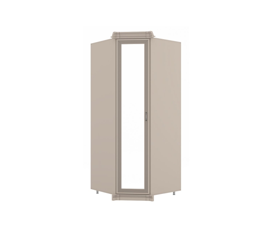 Характеристики:Угловой шкаф для одежды с зеркальным фасадом;Цвет: кашемир серый;В комплекте штанга для одежды и ниша из 5 полок из ЛДСП;Дверь можно навешивать на левую и правую сторону;Шкаф стыкуется со всеми прямыми шкафами из серии «Адажио спальня»;Соединительный цокольный уголок для угловых и прямых композиций входит в стандартную комплектацию;Высота модуля — 223,8 см с учетом высоты лицевого карниза 6,2 см;Есть спил под плинтус;К шкафу, приобретаемому отдельно, нужен комплект карнизов АГ-014.03 (2 шт) и комплект цоколей АГ-012.03 (1 шт).Материалы:Корпус: ЛДСП;Фасад: рамочный с гребенчатым профилем из МДФ, вставка — зеркало 4 мм;На фасадах выполнена отделка испанским акриловым лаком и патиной (эффект состаренного дерева);Опоры — металлические;Фурнитура: Hettich.