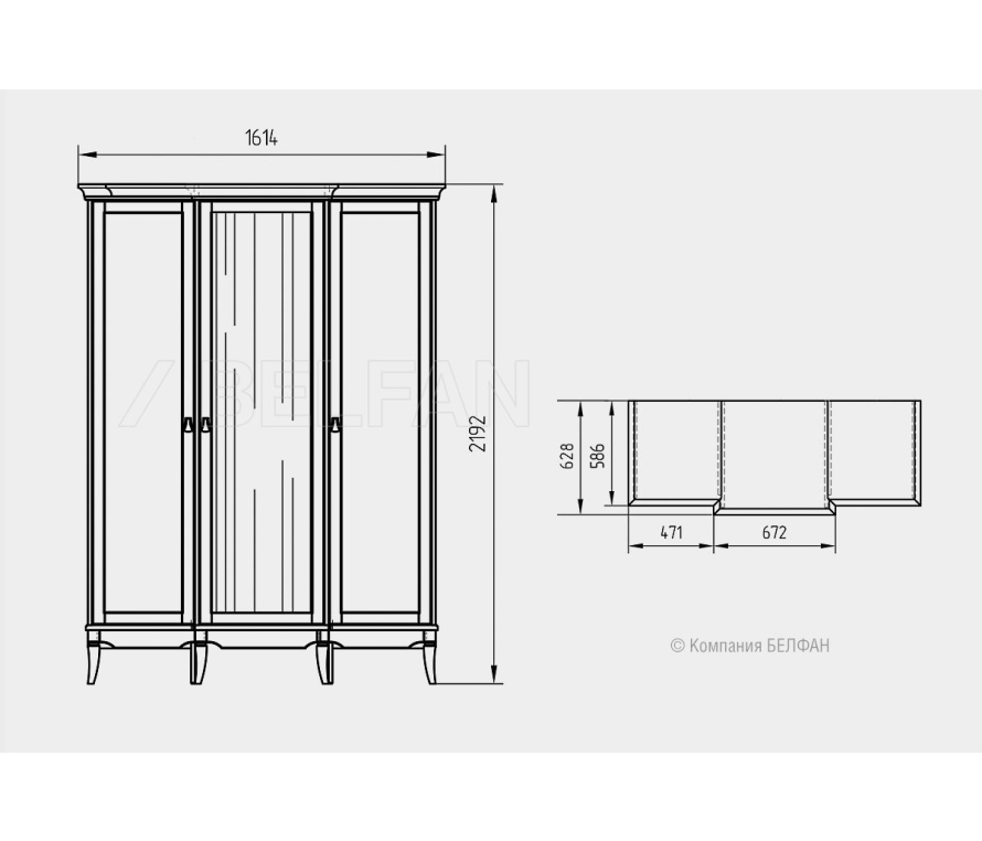 Шкаф для одежды 3-х дверный Стюарт с зеркалом, для Вашей спальни в классическом стиле. Особенности трехдверного шкафа для одежды с зеркалом «Стюарт»: ? Современный классический дизайн. ? Высокие резные ножки изделия с позолоченной фрезеровкой. ? Массивные карнизы в классическом стиле. ? Резные «юбки»-цоколи с позолоченной фрезеровкой. ? Эффектная лицевая фурнитура, выполненная в форме позолоченных кисточек, которая эффектно дополняет позолоченную фрезеровку на ножках и цоколях изделий. ? Сочетание глубоких матовых эмалевых крашений с глянцевыми элементами оттенка натурального дуба. ? Зеркало с изящным фацетом по периметру. ? Европейские петли с доводчиками дают ежедневный комфорт использования. ? В покрытии изделия используются краски и лаки на водной основе, что свидетельствует о безопасности и соответствует высоким стандартам качества. ? Карниз, передние ножки, фасады изделия изготовлены из массива дуба. ? Боковые стенки, цоколь, задние ножки изделия изготовлены из шпонированного дубом МДФ класса безопасности Е1. ? Шкаф состоит из трех секций: пять полок в левой и правой секции, две полки и штанга для одежды в средней. Схема шiкафа: Видеообзор спальни «Стюарт»
