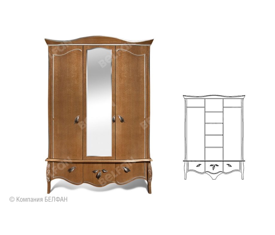 Особенности распашного трёхдверного шкафа для одежды «Трио»: ? Шкаф изготовлен из массива и шпона дуба. ? Изюминку дизайну шкафа придает волнообразная форма карниза из массива дуба с серебряной патиной. ? Продуманное внутреннее наполнение шкафа позволяет аккуратно распределить все вещи и поддерживать порядок в нем. ? Дверные петли с доводчиками (пр-ва Дании) обеспечат плотное и бесшумное закрывание. - Фацет (скошенная грань) на зеркалах создает дополнительную игру света. ? Три выдвижных ящика, дно которых отделано велюром обеспечат дополнительное место для хранения. Цвет ткани может разниться в зависимости от изделия. ? Ящики имеют качественные направляющие с доводчиками полного выдвижения Blum для плавного открывания и бесшумного закрывания (пр-ва Австрии). ? Высококачественная лицевая фурнитура Bosetti Marella (пр-ва Италии), ручки в виде лепестков. ? Высота фигурных ножек из массива дуба позволяет легко проводить влажную уборку, ведь чистота и свежесть в спальне очень важны. ? Экологичное покрытие шкафа Trio - окрашено краской и лаком на водной основе. Схема irfaf: