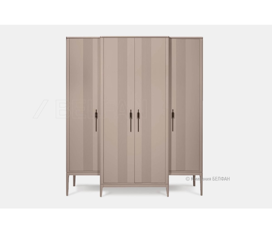 Особенности четырехдверного шкафа для одежды «Dune» (Дюна): ? Современный классический дизайн по последним европейским трендам. ? Эффектные фасады с графичной фрезеровкой, украшенные стильной дизайнерской фурнитурой, придают коллекции уникальность и респектабельность . ? Soft forms – прямые лаконичные формы с плавными линиями и углами придают особенное изящество предметам коллекции. ? Высокие утонченные ножки создают эффект пространственной легкости. ? Ножки изделий изготовлены из массива березы. ? Корпус и фасады изготовлены из МДФ европейского качества. ? В покрытии изделия используются лаки и краски на водной европейского производства, что свидетельствует о безопасности и соответствует высоким стандартам качества. ? Дверцы имеют петли с доводчиками (Европейского пр-ва), что обеспечит плавное открывание и бесшумное закрывание. ? Ящики оснащены направляющими скрытого монтажа с доводчиками (Европейского пр-ва) для комфортного пользования. Видеообзор: коллекция Дюна