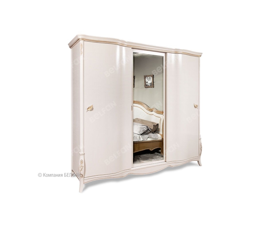 Благодаря своим размерам шкаф-купе из коллекции «Трио» позволит разместить гардероб всей семьи. В боковых секциях расположены две полки и штанги для одежды, куда можно повесить платья, костюмы и длинную верхнюю одежду, а в центральной – штанга для плечиков и три полки, на которых Вы сможете сложить футболки, джемпера и джинсы. Бесшумные двери-купе делают этот шкаф идеальным для спальни: ни один шум не разбудит Вас утром. Несмотря на свои внушительные размеры, этот шкаф Trio выглядит изящно и утонченно благодаря волнистой «юбке» и фурнитуре в виде лепестков. Благородные оттенки крашения «коньяк с серебряной патиной», «белая эмаль с золотой патиной» и «белая эмаль с серебряной патиной» гармонично дополняют «образ» и делают это изделие универсальным и подходящим практически к любому интерьеру. Особенности 3-х дв. шкафа-купе «Трио»: ? Изготовлен из массива и шпона дуба ? Экономит место в помещении, благодаря раздвижным дверям. ? Двери-купе бесшумные (при движении нет вибрации). ? Механизм раздвижных дверей - HAFELE (пр-ва Германии). ? Универсальный и очень вместительный благодаря продуманной внутренней компоновке: имеет три отделения, где крайние с двумя несъёмными щитовыми полками и штангой для плечиков, среднее с тремя несъёмными полками и штангой для плечиков ? Пыль не попадает в шкаф благодаря ворсистому уплотнителю на дверках. ? Ручки Bosetti Marella (пр-ва Италии) в виде лепестков. ? Экологическое покрытие – лак на водной основе. Схема шкафа: