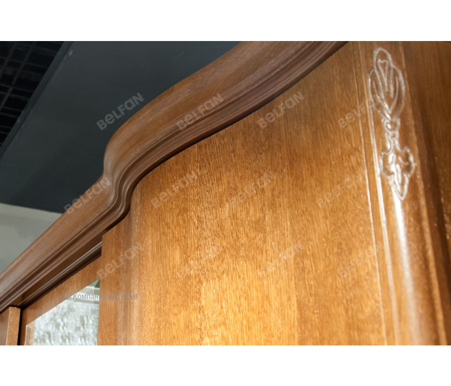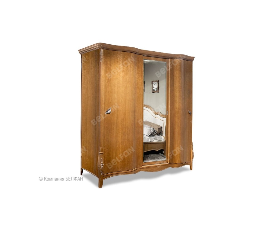 Благодаря своим размерам шкаф-купе из коллекции «Трио» позволит разместить гардероб всей семьи. В боковых секциях расположены две полки и штанги для одежды, куда можно повесить платья, костюмы и длинную верхнюю одежду, а в центральной – штанга для плечиков и три полки, на которых Вы сможете сложить футболки, джемпера и джинсы. Бесшумные двери-купе делают этот шкаф идеальным для спальни: ни один шум не разбудит Вас утром. Несмотря на свои внушительные размеры, этот шкаф Trio выглядит изящно и утонченно благодаря волнистой «юбке» и фурнитуре в виде лепестков. Благородные оттенки крашения «коньяк с серебряной патиной», «белая эмаль с золотой патиной» и «белая эмаль с серебряной патиной» гармонично дополняют «образ» и делают это изделие универсальным и подходящим практически к любому интерьеру. Особенности 3-х дв. шкафа-купе «Трио»: ? Изготовлен из массива и шпона дуба ? Экономит место в помещении, благодаря раздвижным дверям. ? Двери-купе бесшумные (при движении нет вибрации). ? Механизм раздвижных дверей - HAFELE (пр-ва Германии). ? Универсальный и очень вместительный благодаря продуманной внутренней компоновке: имеет три отделения, где крайние с двумя несъёмными щитовыми полками и штангой для плечиков, среднее с тремя несъёмными полками и штангой для плечиков ? Пыль не попадает в шкаф благодаря ворсистому уплотнителю на дверках. ? Ручки Bosetti Marella (пр-ва Италии) в виде лепестков. ? Экологическое покрытие – лак на водной основе. Схема шкафа: