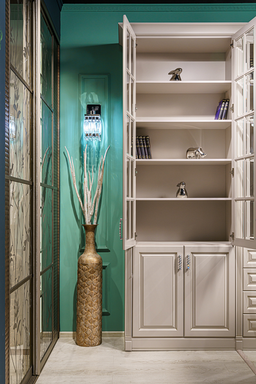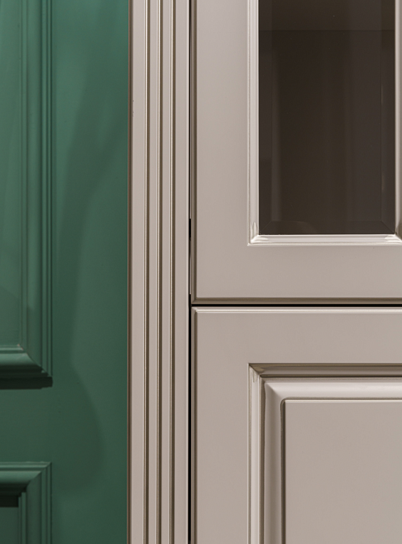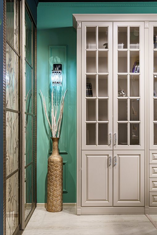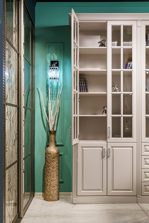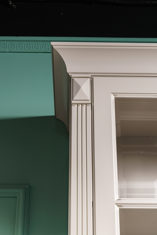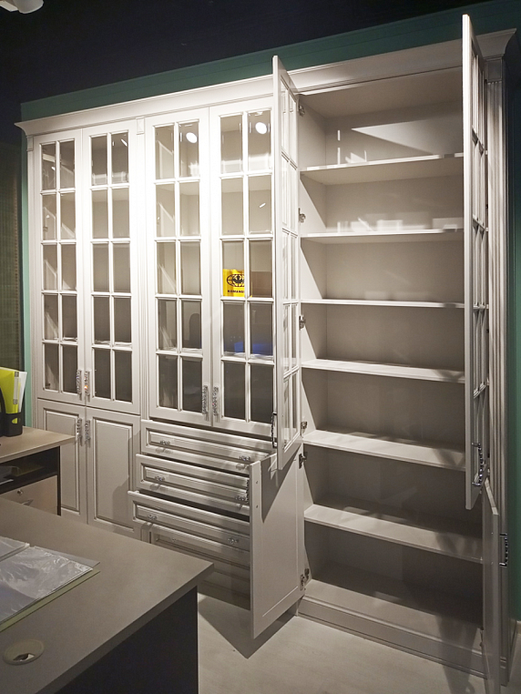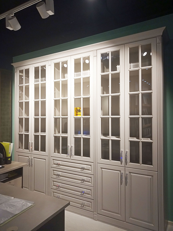 Шкаф для библиотеки классический из МДФ, окрашенного эмалью, с распашными дверями глухими, дверями со вставками из прозрачного стекла, ящиками полного выдвижения с доводчиками BLUM. Фасад изделия - МДФ окрашенный эмалью, цвет CS010 Grigio Cemento (Color SYSTEM), патина цвет "шампань". Корпус изделия - ЛДСП EGGER 16мм, цвет U702 ST9 кашемир серый. Внутреннее наполнение - корпус, полки - ЛДСП EGGER 16мм, цвет U702 ST9 кашемир серый. Двери на петлях Blum плавного закрывания, ящики полного выдвижения с направляющими Blum -Tandem Plus Blumotion плавного закрывания. *Указана минимальная стоимость услуг без учета стоимости услуг.