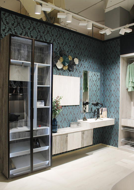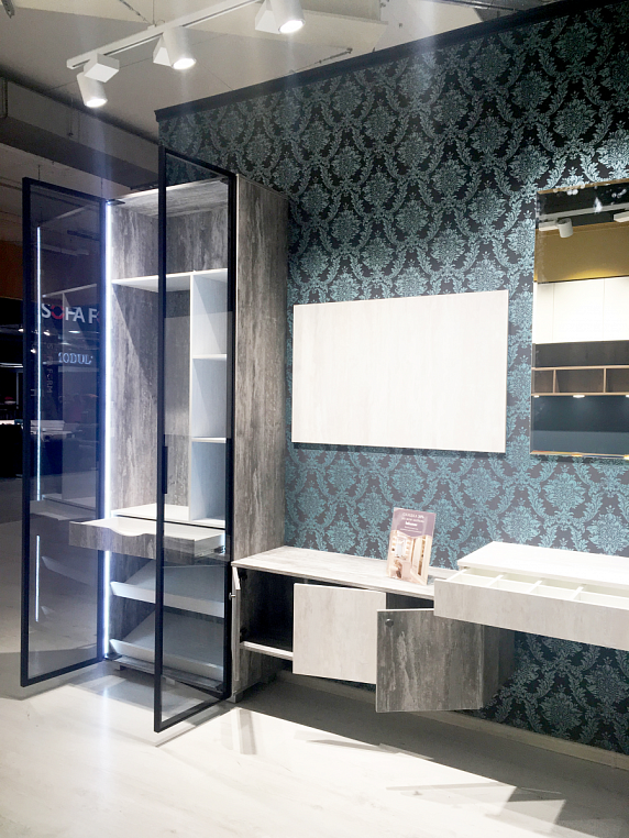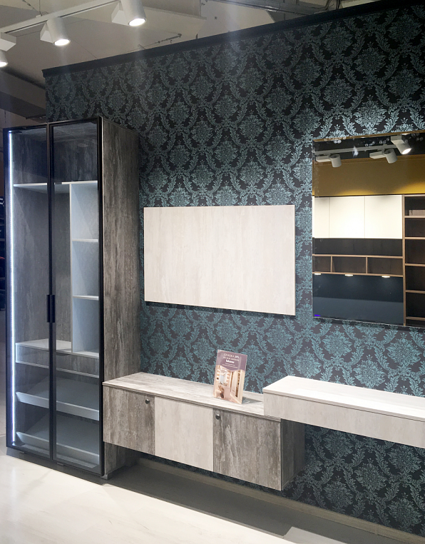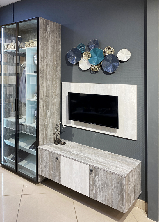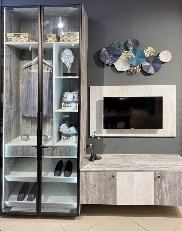 Фасад шкафа - стекло оптивайт Фасад тв-зоны и туалетного столика - ЛДСП Alvic Ice cream -1, 2 Профиль - RPS (Германия) Корпус изделий выполнен из ЛДСП Alvic Ice cream -1, 2 *Указана минимальна стоимоимость изделия без учета стоимости услуг Туалетный столик — локальное женское царство, которым можно обзавестись даже в маленькой спальне и твердо знать, что это пространство принадлежит только вам. Дамский столик, выполненный в минималистическом стиле, вполне может выполнять роль рабочей поверхности, где удобно расположиться с ноутбуком или книгой. Расположенное сверху зеркало позволит с легкостью сделать прическу или макияж. Снизу длинный ящик без ручек легко открываются благодаря механической системе открывания – нужно лишь нажать на фасад в любом месте. Благодаря предлагаемому в качестве опции синхронизатору TIP-ON работает даже с широкими ящиками. Для закрывания необходимо прижать фасад рукой. Внутри ящика предусмотрены деления для удобства хранения косметики или мелочей. Телевизор в спальне — довольно часто встречаемый вид техники в этой комнате. Многим нравятся перед сном или сразу после пробуждения посмотреть фильмы или телепередачи. Поэтому туалетный столик плавно перетекает в ТВ зону. Здесь представлена навесная тумба с открывающимися фасадами. Дополняют фасады ручки-кнопки цвета олово в стиле лофт. Плавное закрывание дверей обеспечивает петля CLIP top с доводчиком BLUMOTION. Совершенное движение от Blum. Это фурнитура нового поколения. Она характеризуется совершенной технологией, высоким качеством используемых материалов и безупречным комфортом движения. Зона крепления телевизора дополнена панелью SYNCRONE. Шкаф для одежды с распашными дверями системы RPS от компании RAUMPLUS (Германия) - это новое предложение, которое полностью соответствует последним тенденциям дизайна в организации корпусных систем хранения. Достоинствами системы RPS являются высокая надежность, привлекательный внешний вид и простота использования. Система подходит для использования в организации гардеробных комнат и шкафов. В шкафу использована система цвета темная бронза в сочетании стекла графит. Для удобства хранения обуви предусмотрены наклонные полки для обуви, торцевое вешало для короткой одежды и ящик для хранения мелочей с фасадом с выпилом под руку. Вся конструкция выполнена из текстурированных фасадов ALVIC Synchron. Основа материала состоит из плиты ДСП, а наружный слой – из текстурированного пластика. Текстурированный пластик Алвик Синхрон одновременно и защищает фасад от различных негативных воздействий, и придает ему схожесть с одним из природных материалов. Подсветка шкафа по бокам придает ему некий шик и прозрачность. Элегантная простота данной композиции вписывается в любое помещение и потому всегда остается в моде.