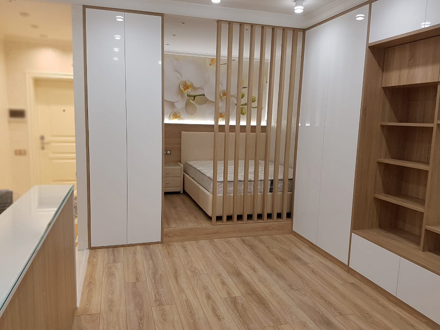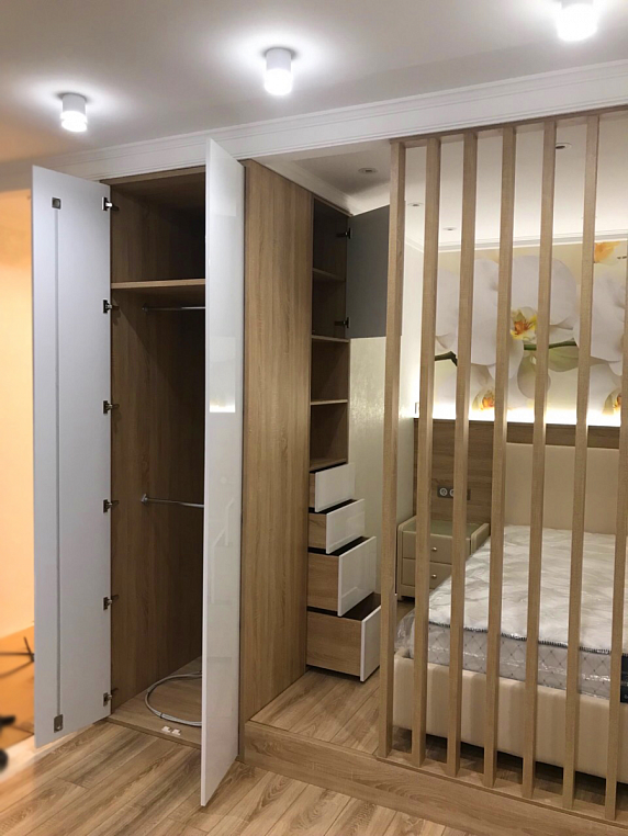 Фасад изделия - МДФ ALVIC белый глянец, петли Blum Корпус - ЛДСП Egger Дуб бардолино натуральный *Указана стоимость изделия в минимальной комплектации без учета стоимости доставки Посмотреть гостиную из этого проекта
