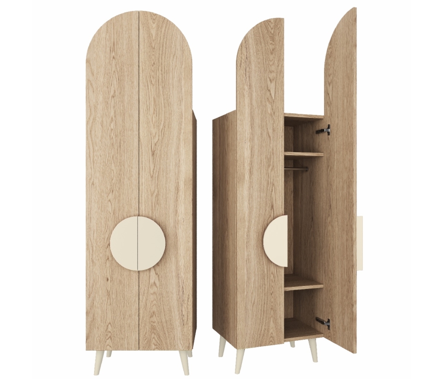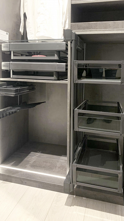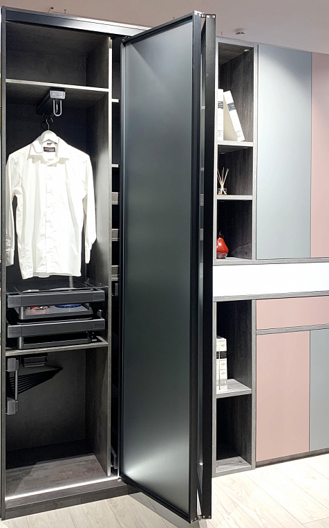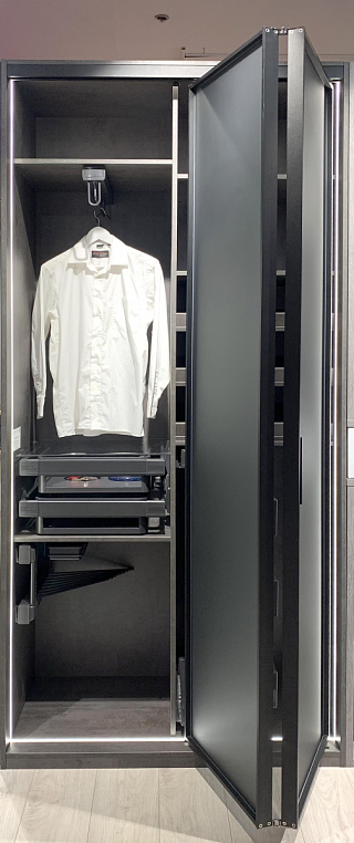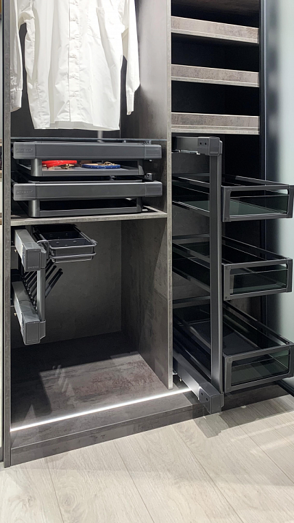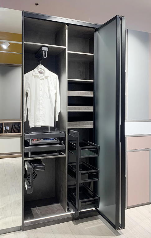 Внутреннее наполнение: Ящики, вешалка для брюк, вешалка для одежды, корзина для одежды, вешалка для брюк, полки из ЛДСП, подсветка