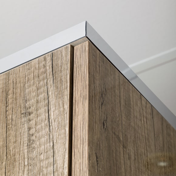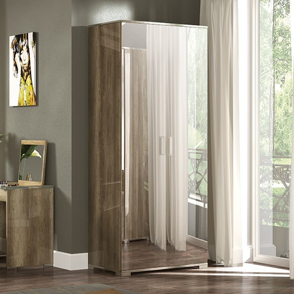 Фасад шкафа выполнен в цвете дуб каньон, в отделке применяется высокоглянцевое лаковое покрытие.Центральные двери шкафа оборудованы зеркалами. Шкаф имеет одно отделение и комплектуется полкой и штангой для верхней одежды.Двери шкафа оснащены системой плавного закрывания-доводчиками.