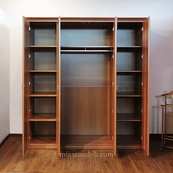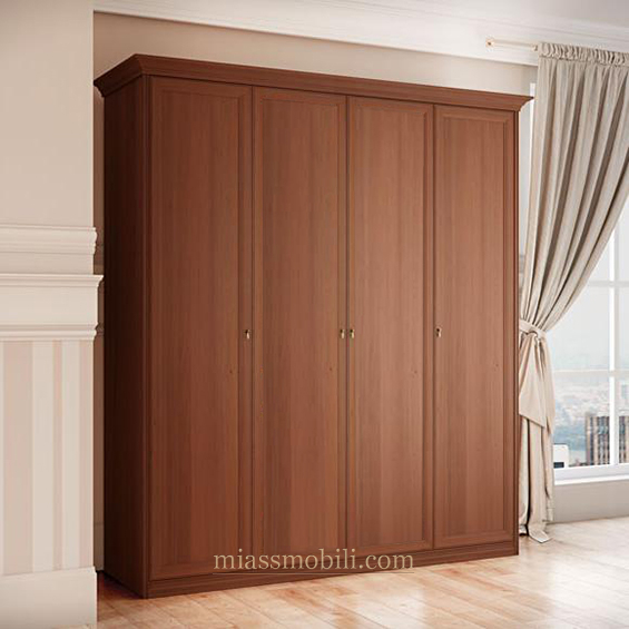 Шкаф четырехдверный выполнен в цвете орех. Шкаф имеет три отделения. В левой и правой части установлены полки. Центральное отделение шкафа оборудовано полкой и штангой для хранения верхней одежды. Габаритный размер указан по максимально выступающим частям изделия.