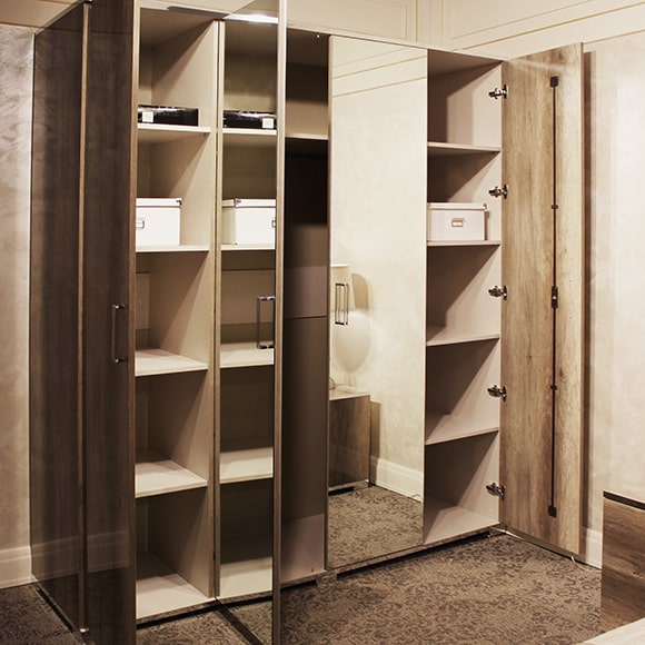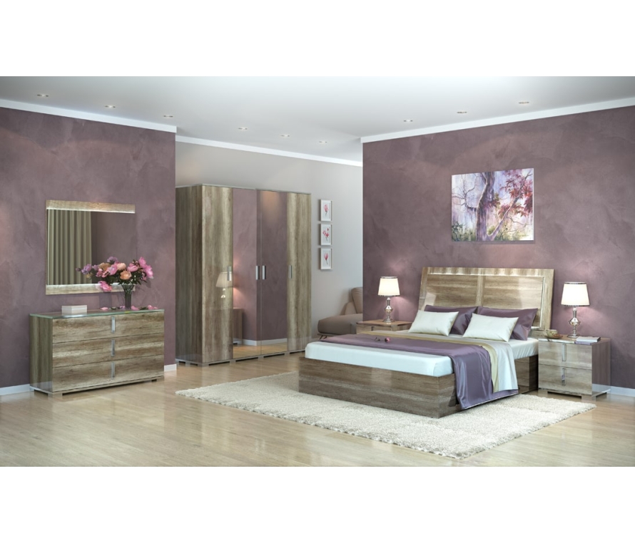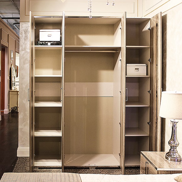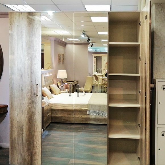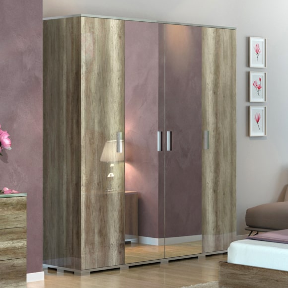 Шкаф выполнен в цвете дуб каньон, в отделке применяется высокоглянцевое лаковое покрытие.Центральные двери зеркальные. Шкаф имеет три вместительных отделения. В левой и правой части установлены полки. Центральное отделение оборудовано полкой и штангой для верхней одежды. Двери шкафа оснащены системой плавного закрывания-доводчиками.