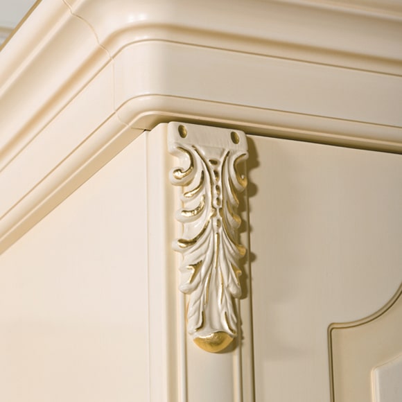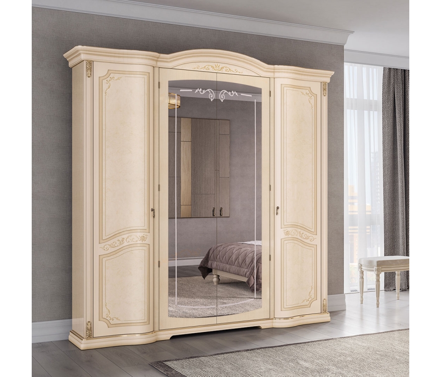 В отделке шкафа 4-дверного используется художественная роспись, выполненная вручную и резные элементы с позолотой. Зеркала украшает изящная гравировка с фацетом. Шкаф имеет три отделения. Слева и справа установлено по четыре полки для хранения белья, по желанию возможна установка полки со штангой. Центральное отделение шкафа оборудована вкладной тумбой. Выдвижные ящики тумбы оснащены системой доводчиков. В верхней части шкафа установлена полка со штангой для хранения верхней одежды.Двери оборудованы системой плавного закрывания (доводки).Габаритный размер указан по максимально выступающим частям изделия.