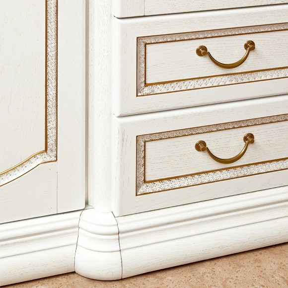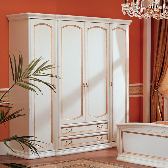 Шкаф четырехдверный с ящиками, коллекция мебели для спальни Luigi, изготовлен с использованием массива и шпона дуба. Шкаф декорирован по технологии декапе и отделкой золотом.Габаритный размер указан по максимально выступающим частям изделия.