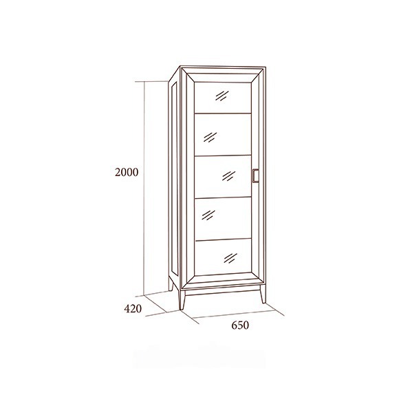 Шкаф угловой предназначен для хранения посуды и столовых принадлежностей. Мебель выполнена в цвете орех с отделкой легкой патиной. Задняя стенка шкафа драпирована тканью и обустроена внутренней подсветкой. Застекленные боковые стенки шкафа создают ощущение легкости. Фасад витрины декорирован резными накладными элементами. Верхняя дверь со стеклом, нижняя дверь-имитация ящиков, внизу отделение с полкой.Габаритный размер указан по максимально выступающим частям изделия.Размер шкафа вдоль стен: 692 мм