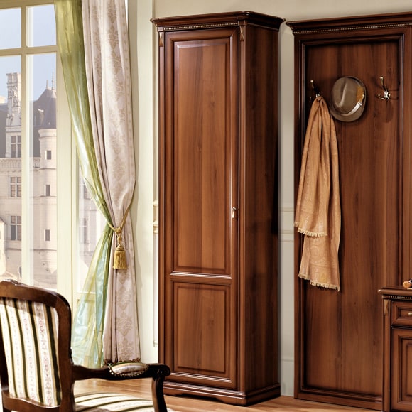 Шкаф однодверный для прихожей оборудован верхней полкой и выдвижной штангой для одежды. Теплый ореховый цвет мебели подчеркивает благородная патина, придавая изделию солидный вид. Карниз украшен декоративными накладными элементами с легкой позолотой. Высококачественная фурнитура цвета античной бронзы обеспечивает долгий срок службы изделия.Габаритный размер указан по максимально выступающим частям изделия.