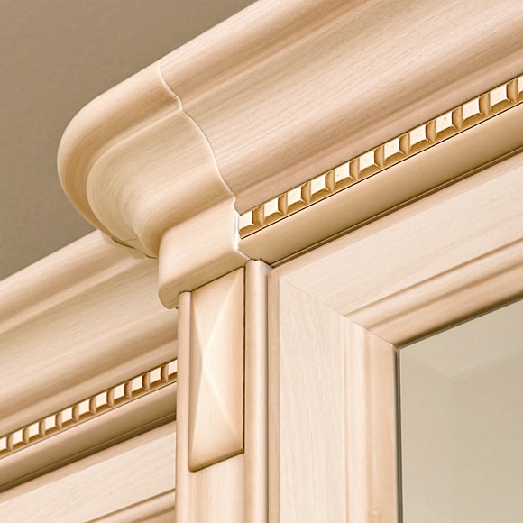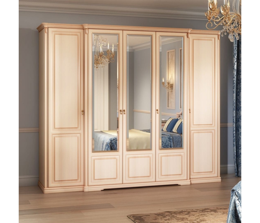 Шкаф 5-ти дверный выполнен в цвете крем с отделкой патиной. Карниз украшен резными декоративными элементами с легкой позолотой. В левой и правой части шкафа установлены полки. Центральное отделение разделено на две секции и оборудовано большой и малой полками со штангами для хранения верхней одежды.Габаритный размер указан по максимально выступающим частям изделия.