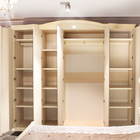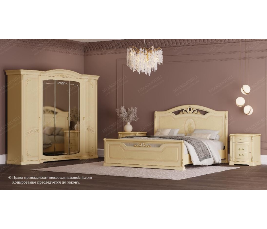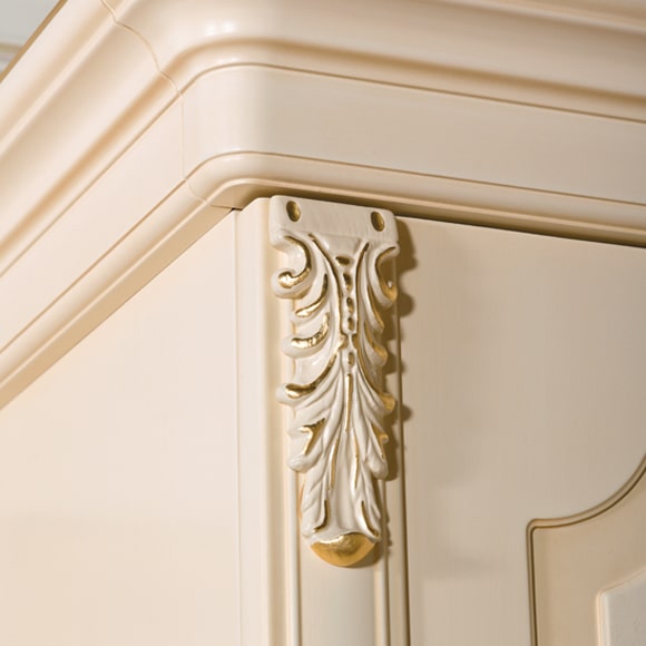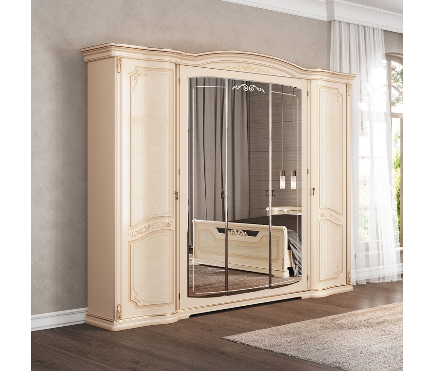 Шкаф 5-дверный декорирован резными элементами с позолотой и ручной художественной росписью. Центральные двери шкафа оборудованы зеркалами с изящной гравировкой и фацетом.Шкаф имеет четыре отделения. Два отделения в левой части шкафа и отделение в правой части шкафа оборудованы полками. В боковые отделения, по желанию, можно установить полки со штангами. В центральном отделении установлена полка со штангой для верхней одежды.Двери оборудованы системой плавного закрывания (доводки).Габаритный размер указан по максимально выступающим частям изделия.