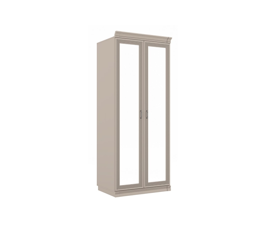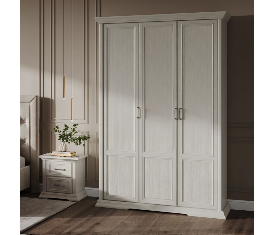 Шкаф 3-х дверный без зеркала. По центру шкафа находятся две полки: полка со штангой и нижняя полка. Боковая часть слева полностью оборудована полками.