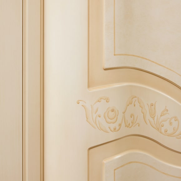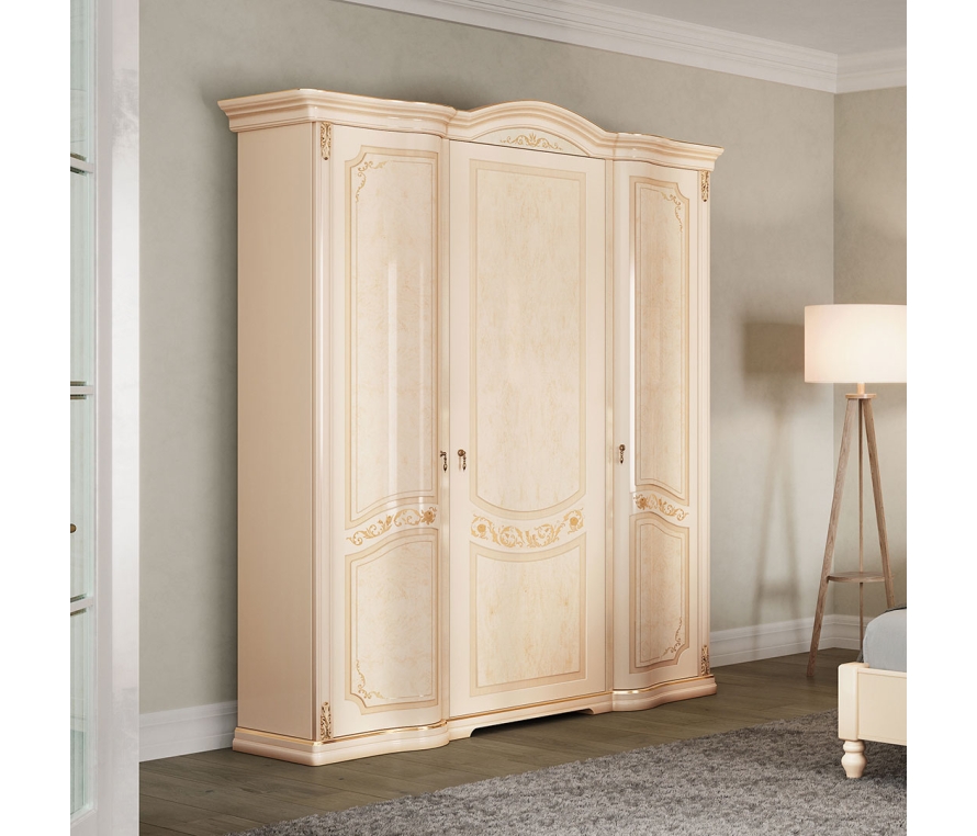 Шкаф 3-дверный декорирован ручной художественной росписью и резными элементами, покрытыми сусальным золотом. Шкаф имеет два отделения. В левой части установлены полки для хранения белья, в правой части сверху установлена полка со штангой для верхней одежды, снизу также установлена большая полка.Двери оборудованы системой плавного закрывания (доводки).Габаритный размер указан по максимально выступающим частям изделия.