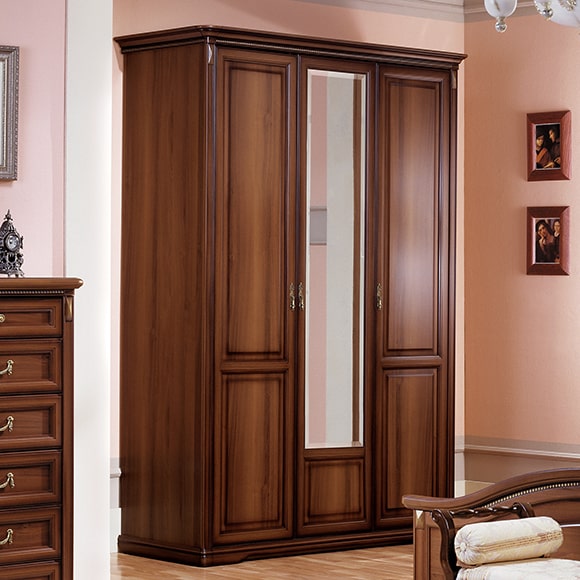 Шкаф 3-дверный, выполнен в цвете орех с отделкой патиной. Карниз украшен резными декоративными элементами с легкой позолотой. Центральная дверь шкафа зеркальная. Изделие имеет два отделения. Большое отделение для хранения верхней одежды оборудовано полкой со штангой. В правой части установлены полки.Габаритный размер указан по максимально выступающим частям изделия.