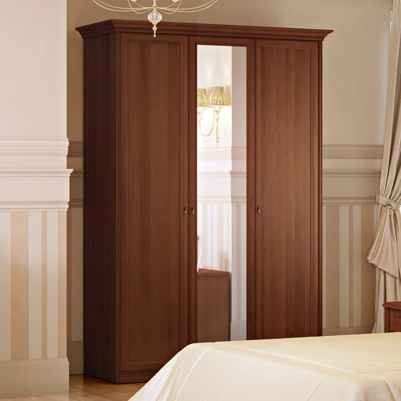 Шкаф 3-дверный выполнен в цвете орех. Центральная дверь шкафа зеркальная. Изделие имеет два отделения. Большое отделение слева предназначено для хранения верхней одежды и оборудовано полкой со штангой. В правой части установлены четыре полки.Габаритный размер указан по максимально выступающим частям изделия.