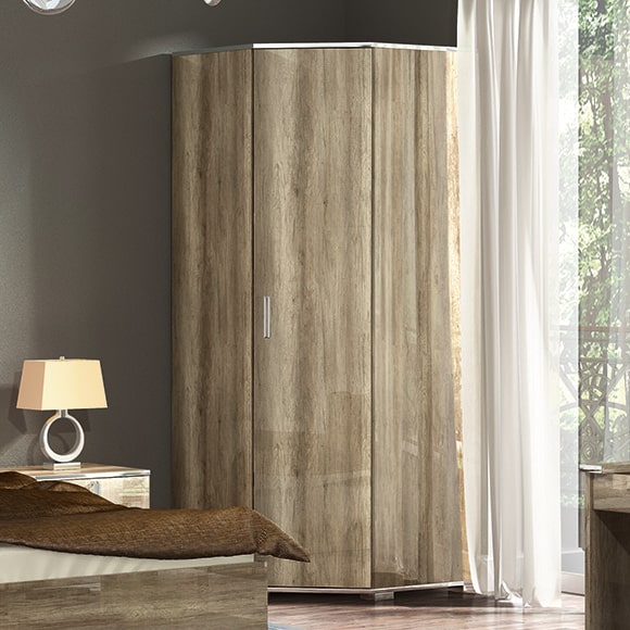 Шкаф угловой выполнен в цвете дуб каньон, в отделке применяется высокоглянцевое лаковое покрытие.Изделие комплектуется полками и штангой для верхней одежды.Двери шкафа оснащены системой плавного закрывания-доводчиками.