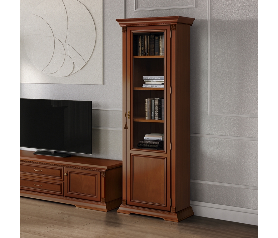 Шкаф для посуды однодверный из коллекции Лоренцо с щитовыми полками. Шкаф выполнен из массива бука и облицован шпоном красного дерева. Габаритный размер указан по максимально выступающим частям изделия.
