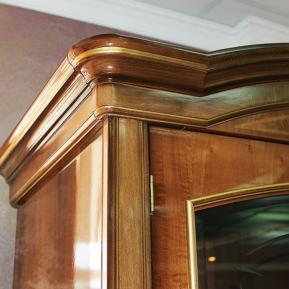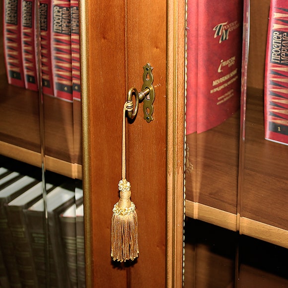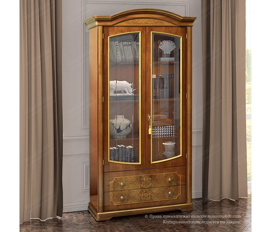 Витрина 2-дверная для книг выполнена с применением массива и шпона натурального дерева. Фасад и карниз отделаны художественным набором шпона - интарсия. Полки регулируются по высоте. Стекло на фасадной части витрины декорировано изящной гравировкой и фацетом.Габаритный размер указан по максимально выступающим частям изделия.