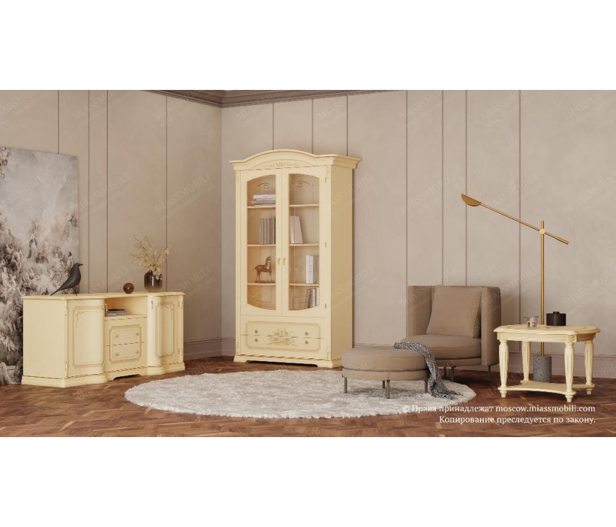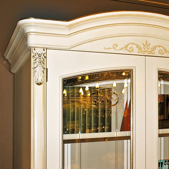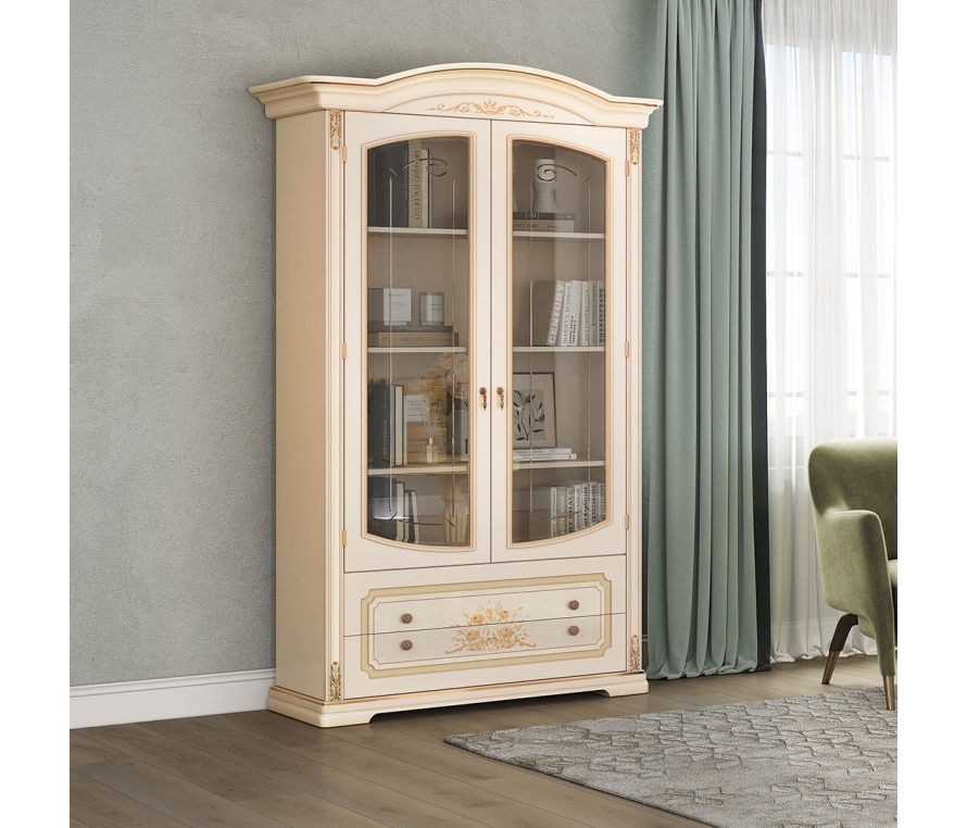 В отделке 2-дверной витрины для книг используется ручная художественная роспись. Резные элементы отделаны золотом. Выдвижные ящики оборудованы системой доводки. Стекла фасадной части витрины украшены изящной гравировкой и фацетом.Габаритный размер указан по максимально выступающим частям изделия.