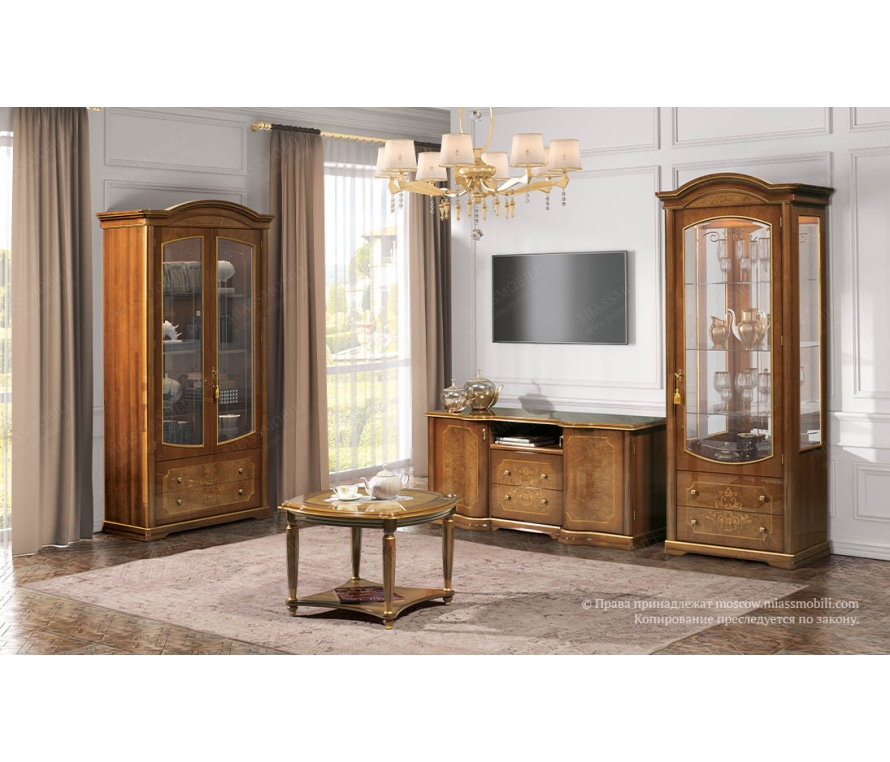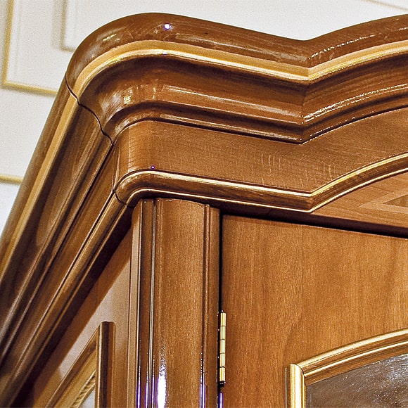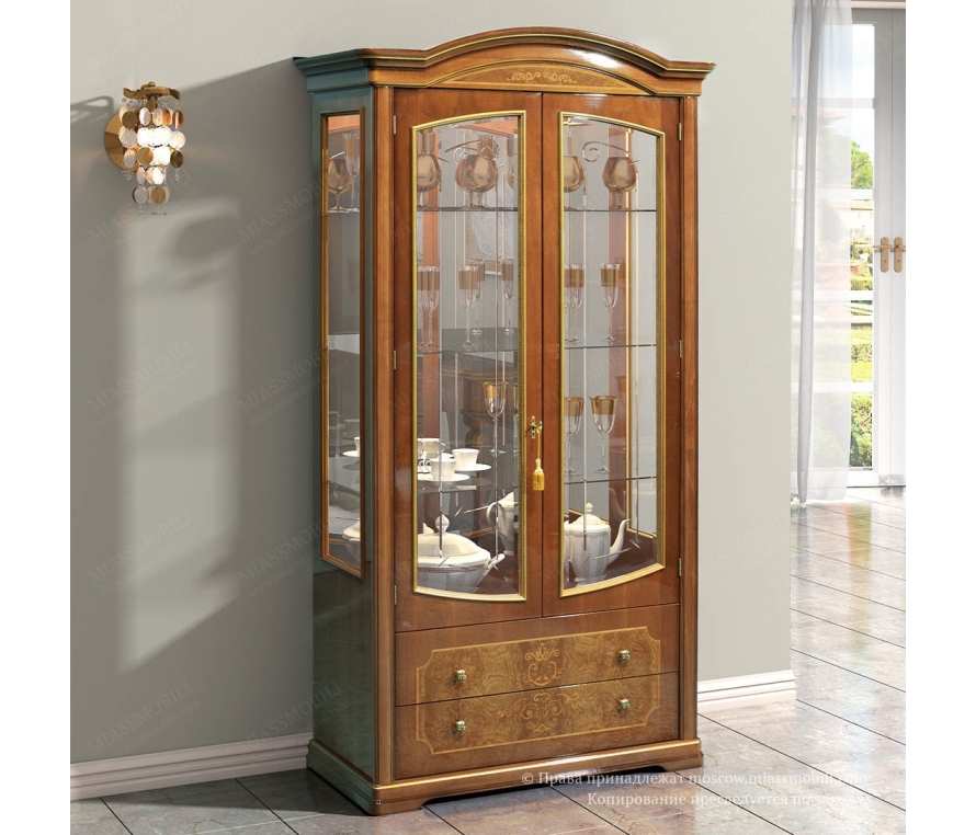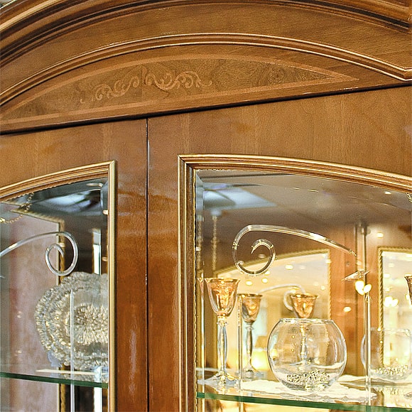 Витрина 2-дверная для посуды изготовлена с применением массива и шпона натурального дерева. В оформлении карниза и фасада используется художественный набор шпона - интарсия. Стекло на фасадной части декорировано изящной гравировкой и фацетом. Полки витрины регулируются по высоте. Выдвижные ящики оборудованы системой доводки.Габаритный размер указан по максимально выступающим частям изделия.