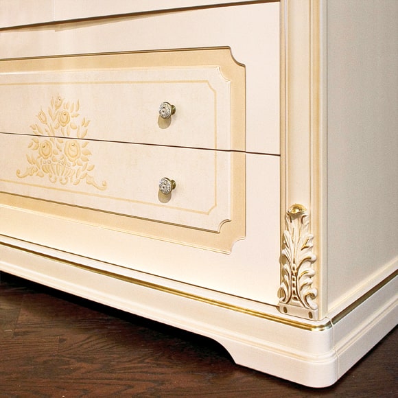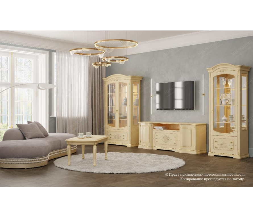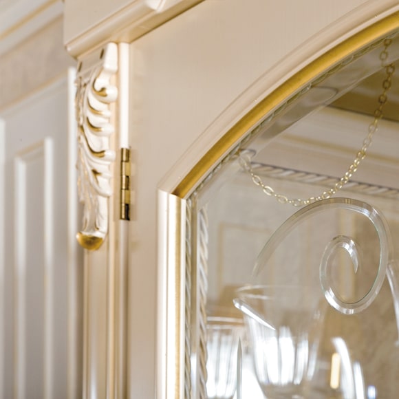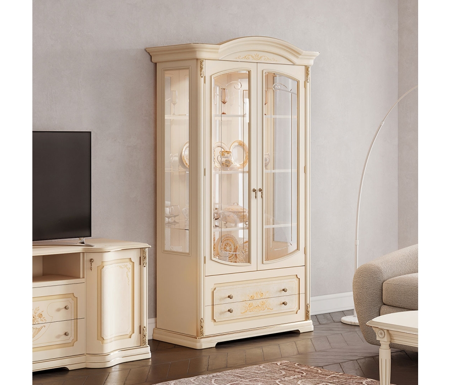 В оформлении 2-дверной витрины используется художественная роспись, выполненная вручную. Полки изделия регулируются по высоте. Выдвижные ящики оборудованы системой доводки. Стекла фасадной части витрины декорированы изящной гравировкой и фацетом. Задняя стенка зеркальная. В верхней части витрины установлена подсветка.Габаритный размер указан по максимально выступающим частям изделия.