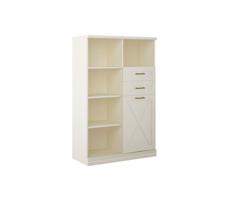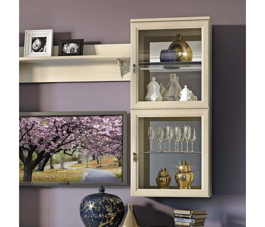 Витрина навесная для посуды из коллекции Екатерина в цвете крем. Витрина имеет два отделения, в каждом из которых установлены стеклянные полки.